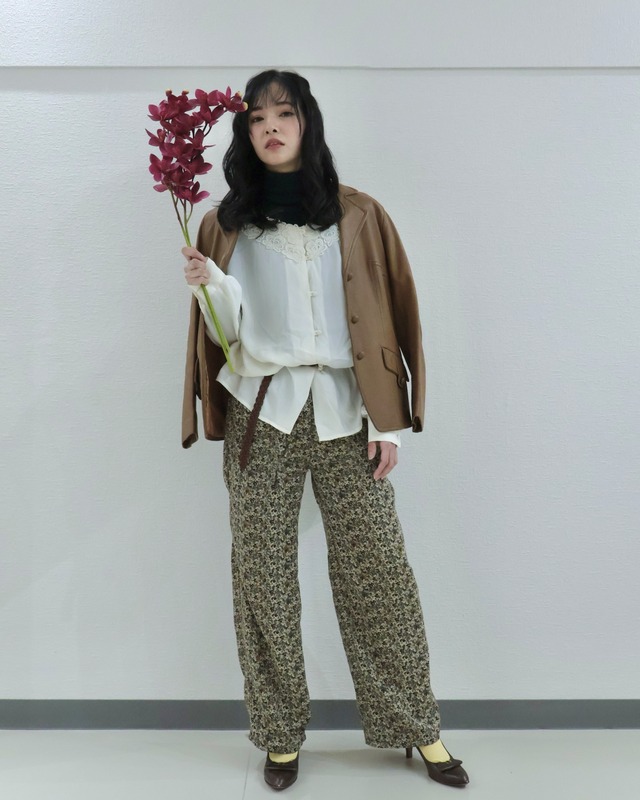 ハイネックフリルブラウスは、上品さと可愛らしさを兼ね備えた主役級の一枚。 胸元にはV字にあしらわれた花柄レースが印象的で、繊細ながらも存在感あるデザイン。 ハイネック部分にはフリルが施されており、レイヤードスタイルでフリルを覗かせる着こなしもおすすめです。 全体に入った斜めのストライプがすっきりとした印象を与え、細見え効果も。 袖はゆったりとしたボリュームのあるシルエットで、動くたびにふわっと揺れる女性らしい雰囲気に。 カフスでしっかりと絞られているため、シルエットにメリハリが出てバランスよくまとまります。 これ一枚でも十分華やかに、またジャケットやカーディガンのインナーとしてレースやフリルをちらりと見せても上品。 オン・オフ問わず、着るだけでコーディネートを格上げしてくれるブラウスです。 (着用モデル:151cm) ⭐︎他の販売アイテム 写真2枚目:①70'Fur coat made in French ②Euro culotte カラー:アイボリー 製造国:おそらくFrance 素材:おそらくポリエステル混合 商品状態:左下に汚れ、バックボタンの一番下一つ外れ、両脇に薄いシミあり(写真枚14、15枚目参照) サイズ表記:表記なし 着丈:67.5cm 身幅:51cm 肩幅:48cm 袖丈:52.5cm ※全て平置きでの採寸です。 「A’sis(アスイズ)」では、Instagramで新商品やイベントの詳細を配信しています。 ぜひ、フォローしてください! Instagram:@asis.vintage ◯他のブラウスアイテムはこちら →https://asisvintage.base.shop/categories/6107707 ・・・ ※こちらの商品は古着となっています。そのため、多少の使用感がございます。 ※販売前に商品の汚れやダメージ等を丁寧に確認しておりますが、稀に見落としがある場合がございます。 ※採寸は手作業で行なっているため、数cm程度の誤差が生じる場合がございます。 ※商品の写真はできる限り実物の色に近づけるよう努めておりますが、ご覧になる環境やモニターの設定により、実物の色味や質感とは異なる場合がございます。 上記の点をご理解のいただいた上でのご購入をお願い申し上げます。 ご不明点がございましたら、ご購入前にお問合せください。 商品ID:440