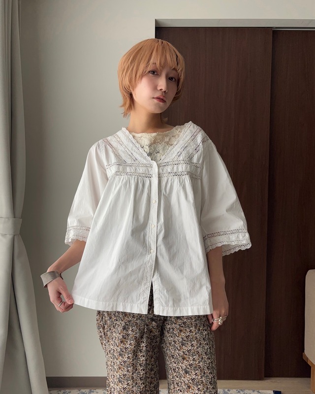 推定1910〜1920年代のアンティークブラウス。 当時はナイトウェアとしても着用されていた背景を持つ、歴史を感じられる一着です。 機械レースが普及する以前の意匠を感じさせる、繊細で手仕事の温もりが残るデザインが魅力。 胸元や袖には細やかなレースが丁寧にあしらわれ、ボタンには小ぶりなシェルボタンを使用。 さっくりと開いたVネックは鎖骨のラインを美しく見せ、胸元のレースによって自然とウエスト位置が絞られ、裾にかけてふわっと広がる優雅なシルエットを描きます。 胸元に施された刺繍も、アンティークブラウスならではの象徴的なディテール。 七分丈の袖とコットン素材で、夏は一枚で涼しく着用可能。 秋冬にはタートルネックをレイヤードすることで、シーズンレスに楽しめます。 日常着としても、特別な一着としても取り入れられる、時代を超えて愛されるアンティークブラウスです。 (着用モデル:151cm) ⭐︎他の販売アイテム 写真7枚目:Wool striped slacks made in Italy https://asisvintage.base.shop/items/125282918 カラー:ホワイト 製造国:Euro 素材:コットン100% 商品状態:汚れなく綺麗な状態 サイズ表記:表記なし 着丈:60cm 身幅:49cm 肩幅:39cm 袖丈:36cm ※全て平置きでの採寸です。 「A’sis(アスイズ)」では、Instagramで新商品やイベントの詳細を配信しています。 ぜひ、フォローしてください! Instagram:@asis.vintage ◯他のシャツ・ブラウスアイテムはこちら →https://asisvintage.base.shop/categories/6107707 ・・・ ※こちらの商品は古着となっています。そのため、多少の使用感がございます。 ※販売前に商品の汚れやダメージ等を丁寧に確認しておりますが、稀に見落としがある場合がございます。 ※採寸は手作業で行なっているため、数cm程度の誤差が生じる場合がございます。 ※商品の写真はできる限り実物の色に近づけるよう努めておりますが、ご覧になる環境やモニターの設定により、実物の色味や質感とは異なる場合がございます。 上記の点をご理解のいただいた上でのご購入をお願い申し上げます。 ご不明点がございましたら、ご購入前にお問合せください。 商品ID:541