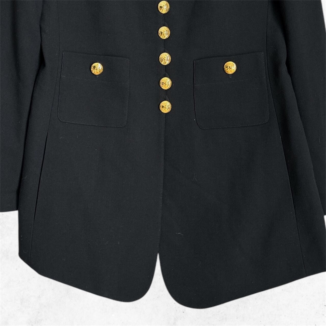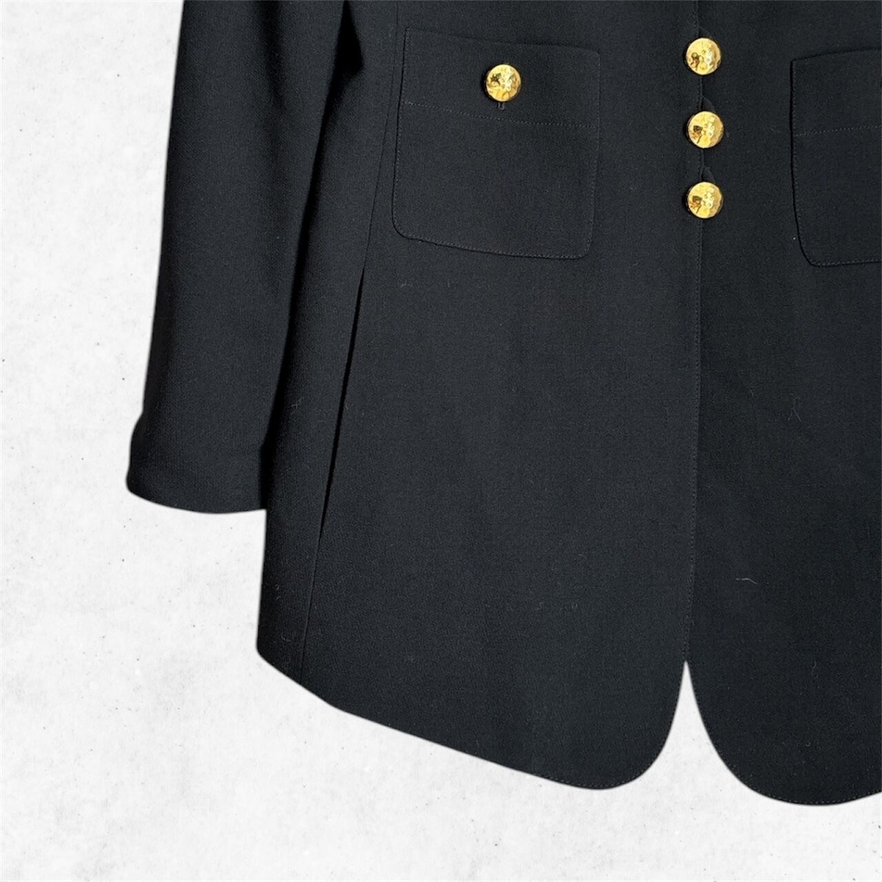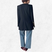 このブラックのロングジャケットは、ざっくりと開いたVラインが上品な印象を与え、ゴールドのポコポコとしたボタンがアクセントに。