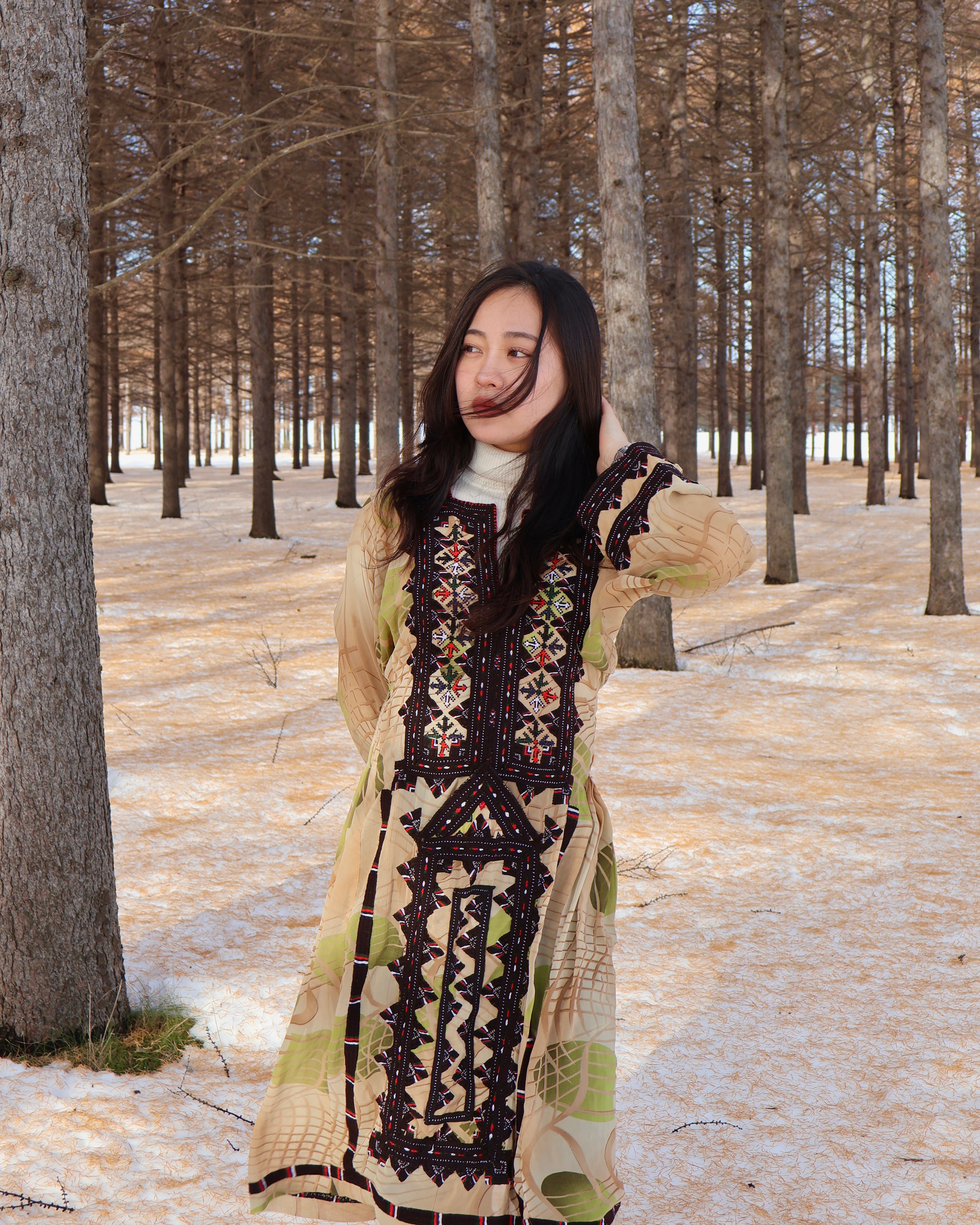 こちらは、柔らかなベージュ地にグリーンの刺繍が施された、落ち着いた中にも華やかさを感じる一着。