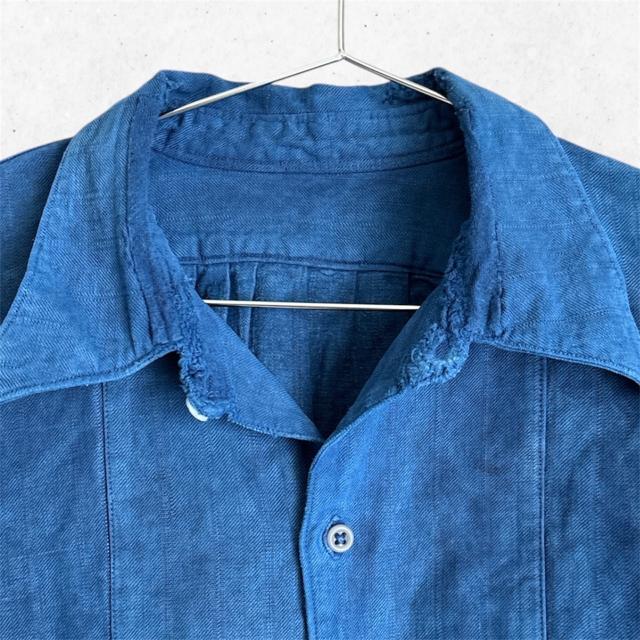 ボタンには当時らしいミルクボタンが使われ、細部にまでヴィンテージらしい趣が感じられます。