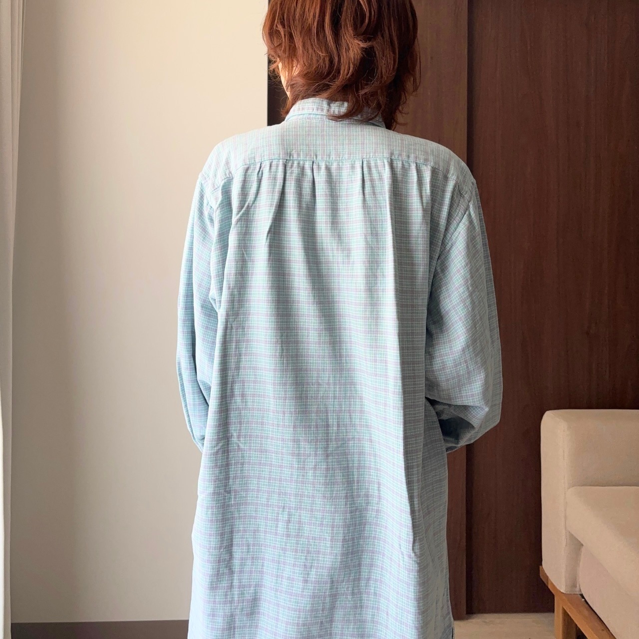 淡いブルーとパープルの小さめチェック柄が、クラシカルでやさしい印象を与えてくれます。