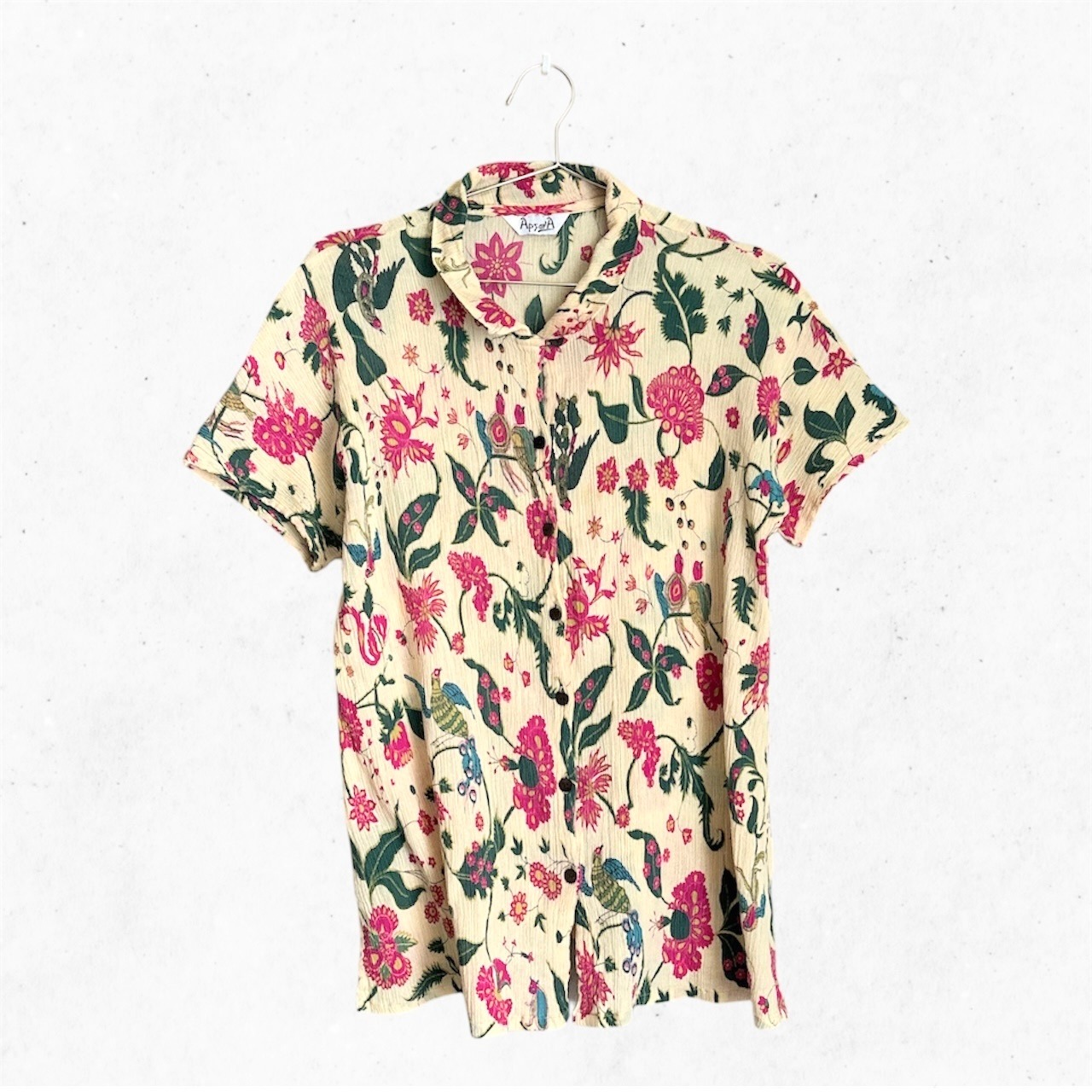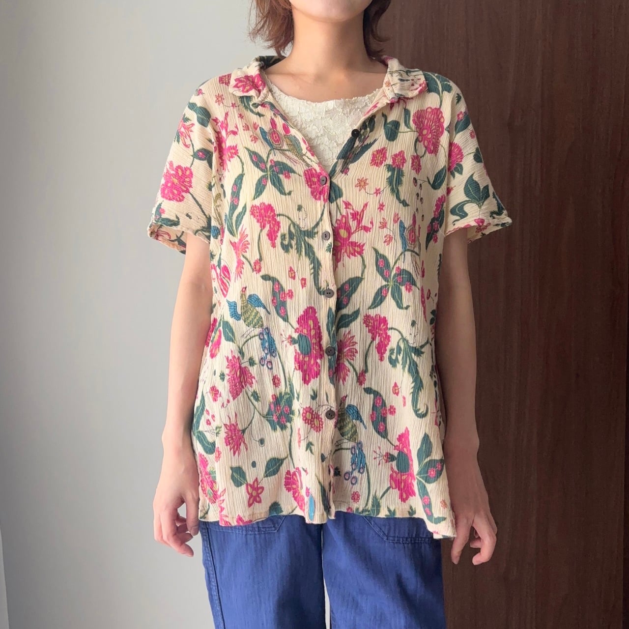 やわらかなベージュ地に、ピンクの花柄が映えるインド綿のエスニックシャツ。