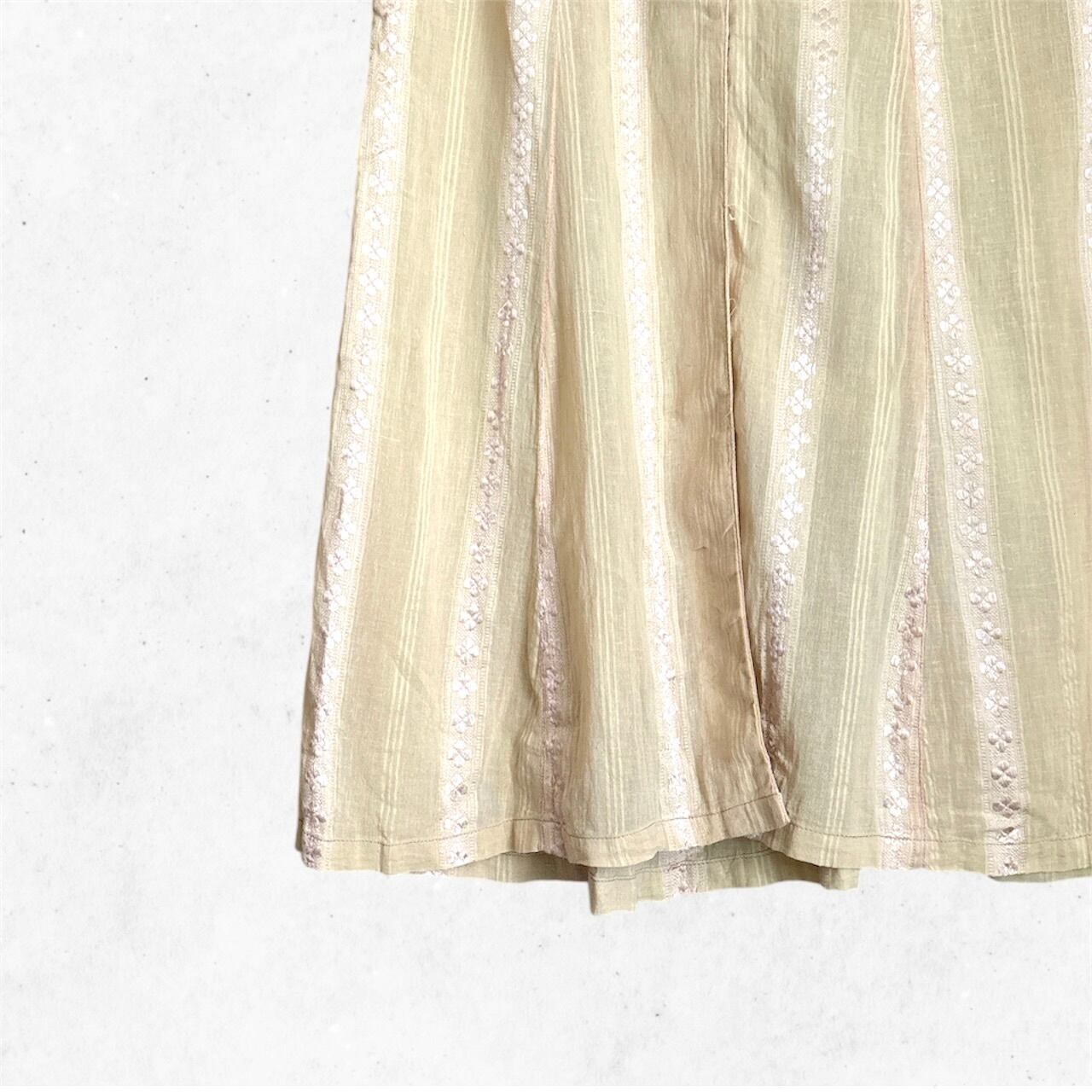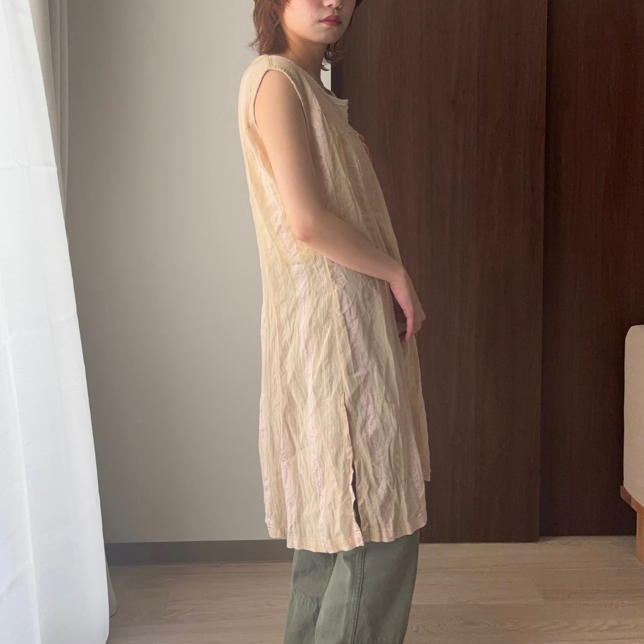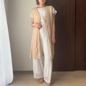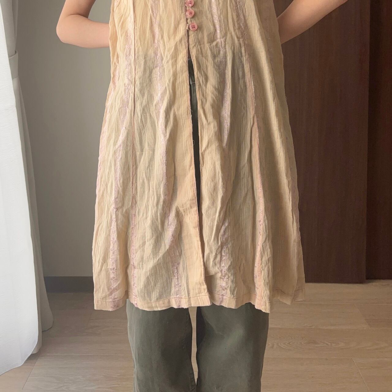 ベージュをベースに、ベビーピンクの刺繍が施されたインド綿のロングベスト。
