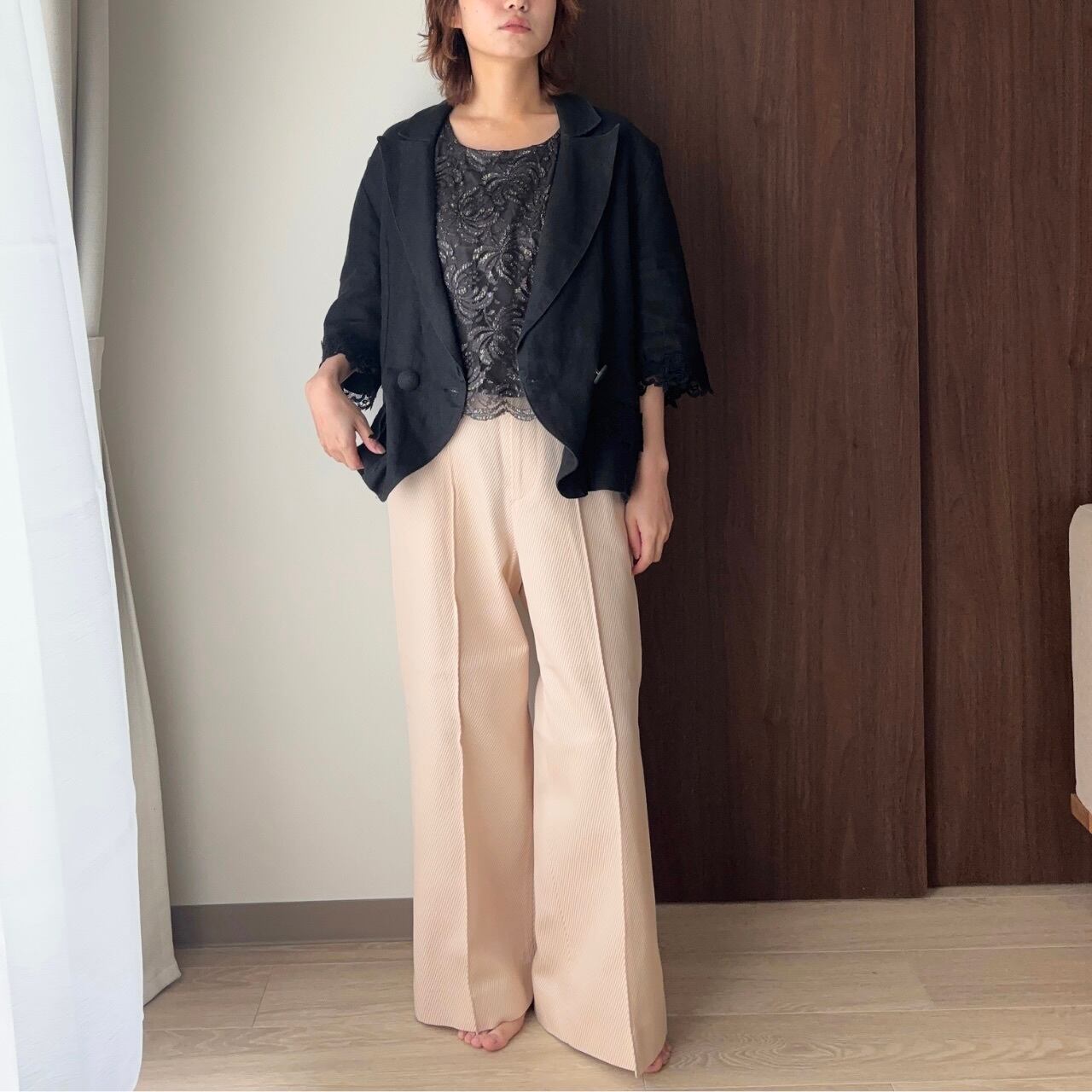 袖とポケットには繊細なレースがあしらわれ、シンプルさの中に上品さをプラス。
