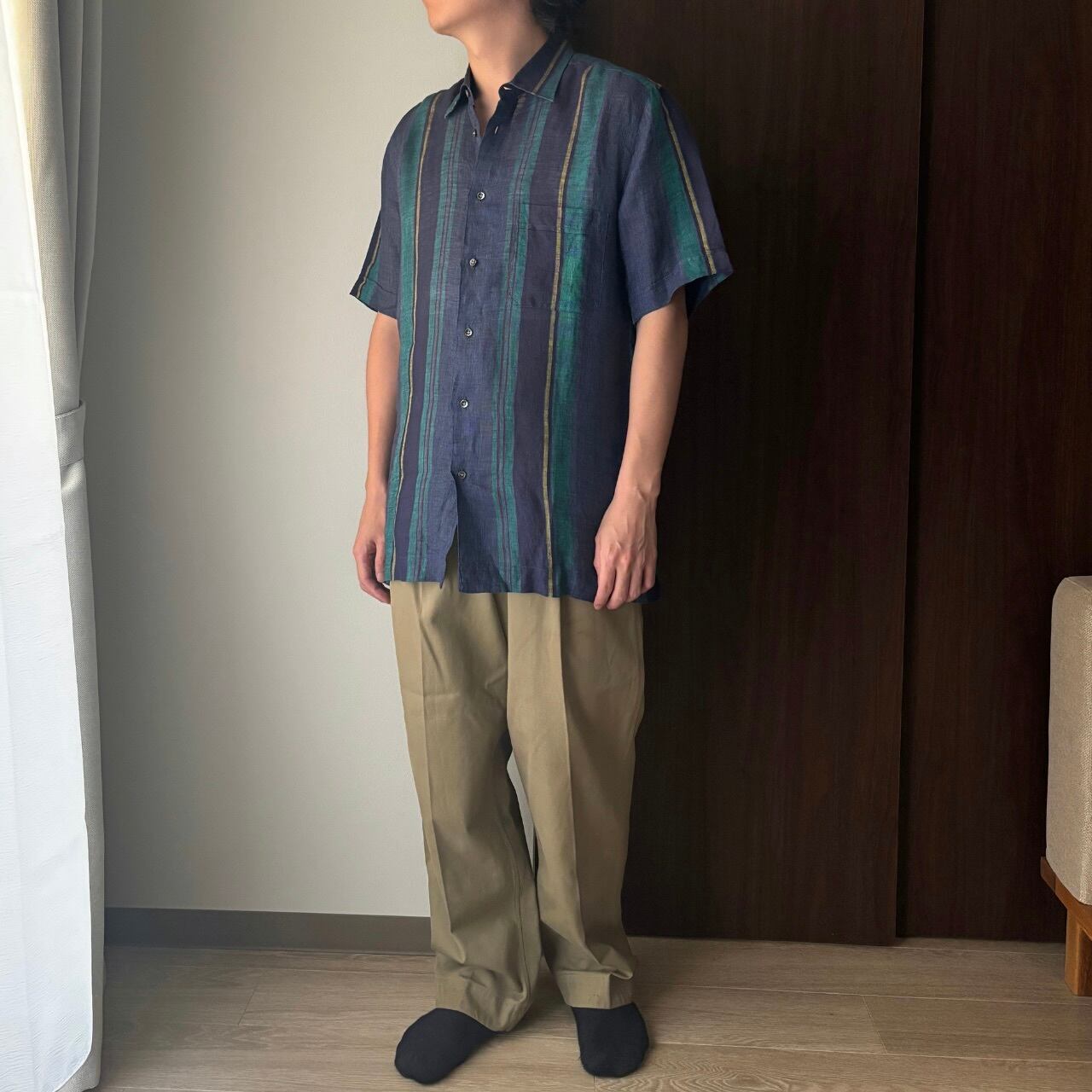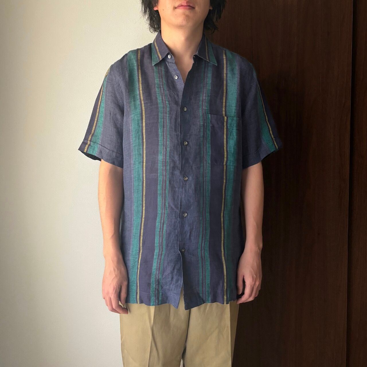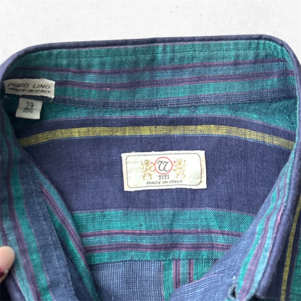 80〜90年代イタリア製のシャツは、ネイビーとグリーンのストライプが落ち着いた雰囲気を漂わせる大人の一枚。