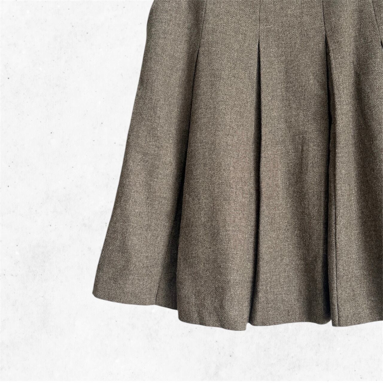 上質なウールツイード生地をたっぷりと使ったクラシカルなデザインで、フロントに施された深めのタックとウエストのボタンがアクセントになっています。