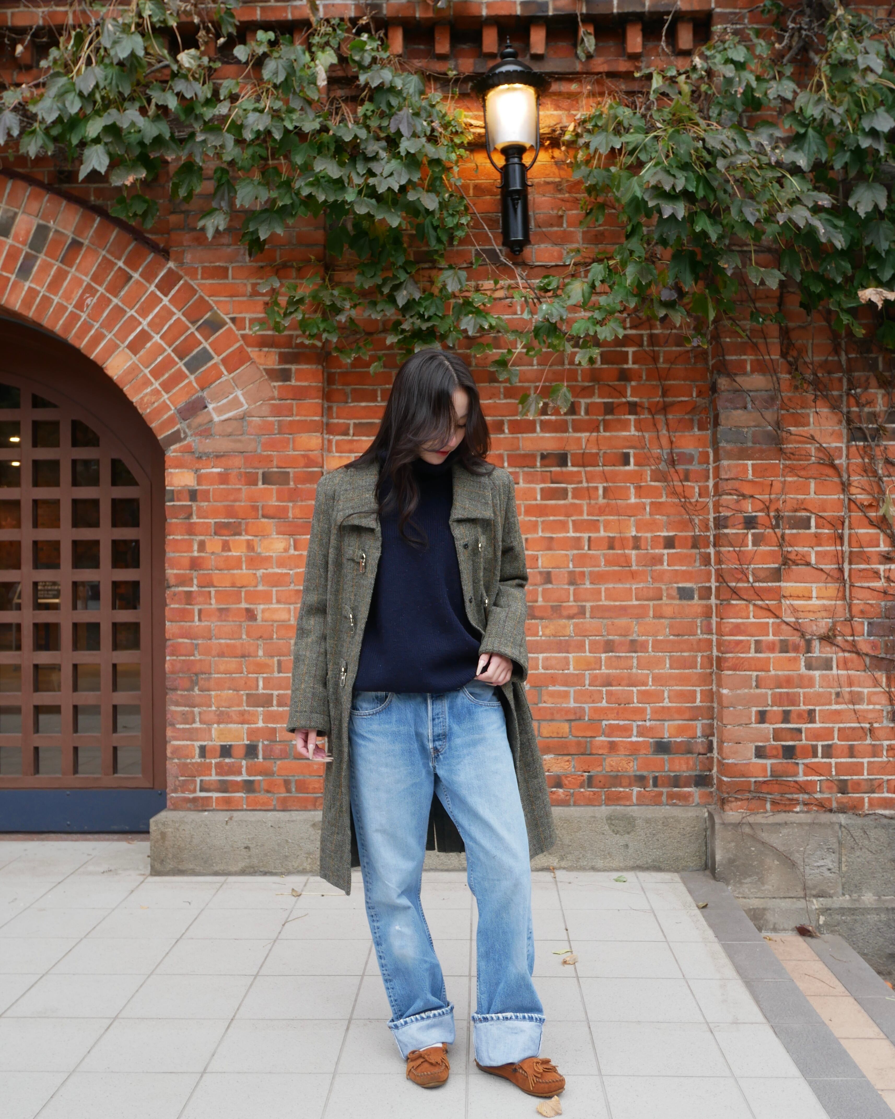 クラシックなストレートシルエットが特徴で、どんなスタイルにも合わせやすく、シンプルながらも洗練された印象を与えます。