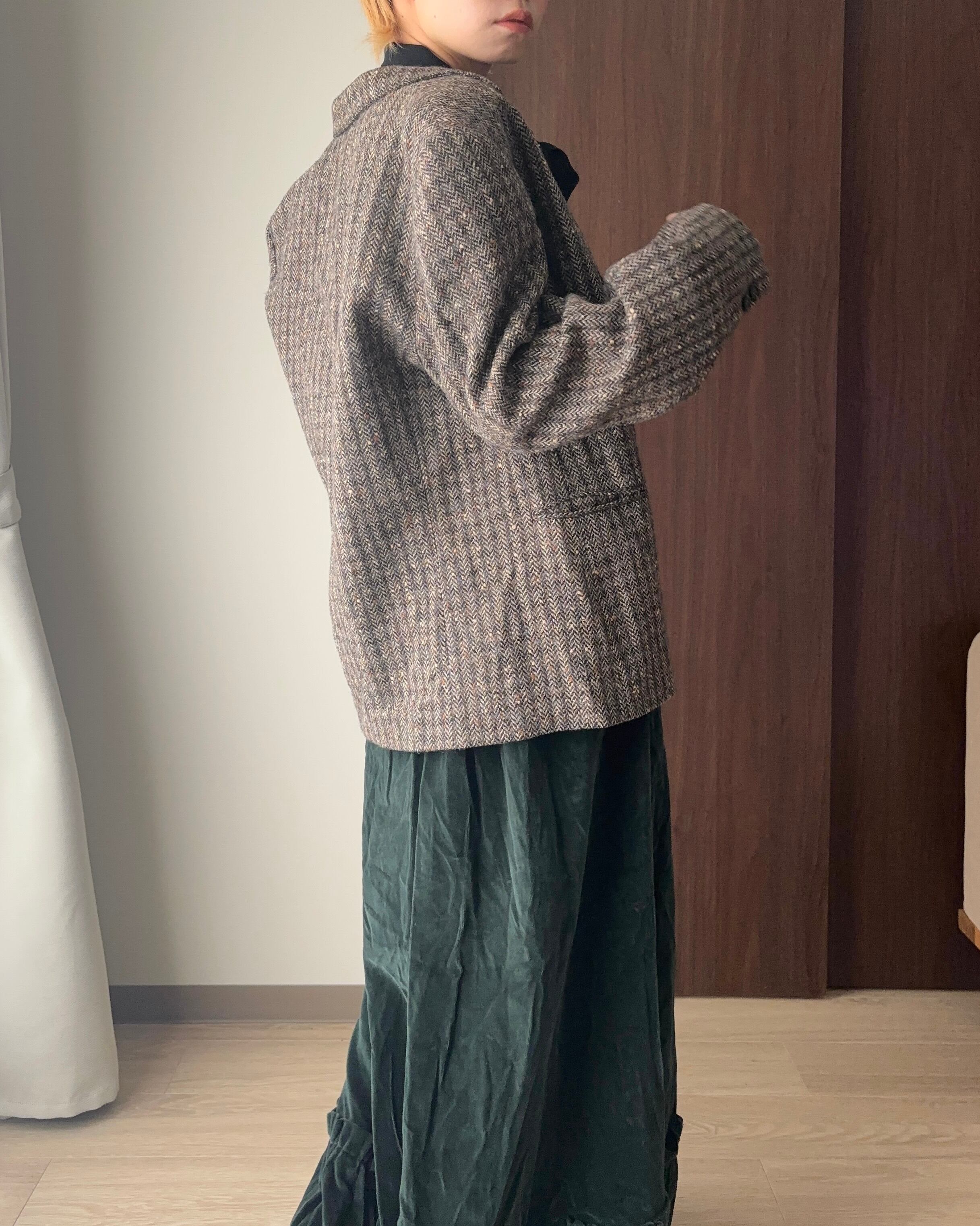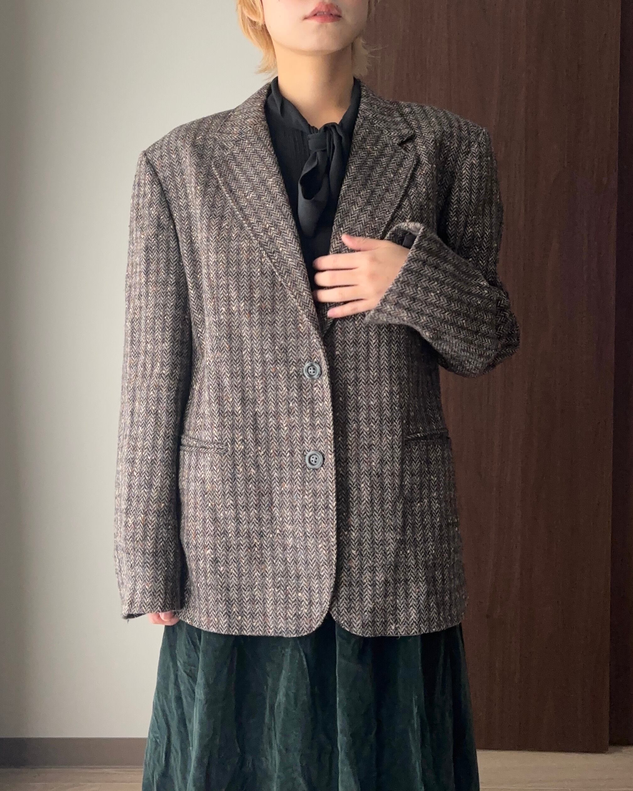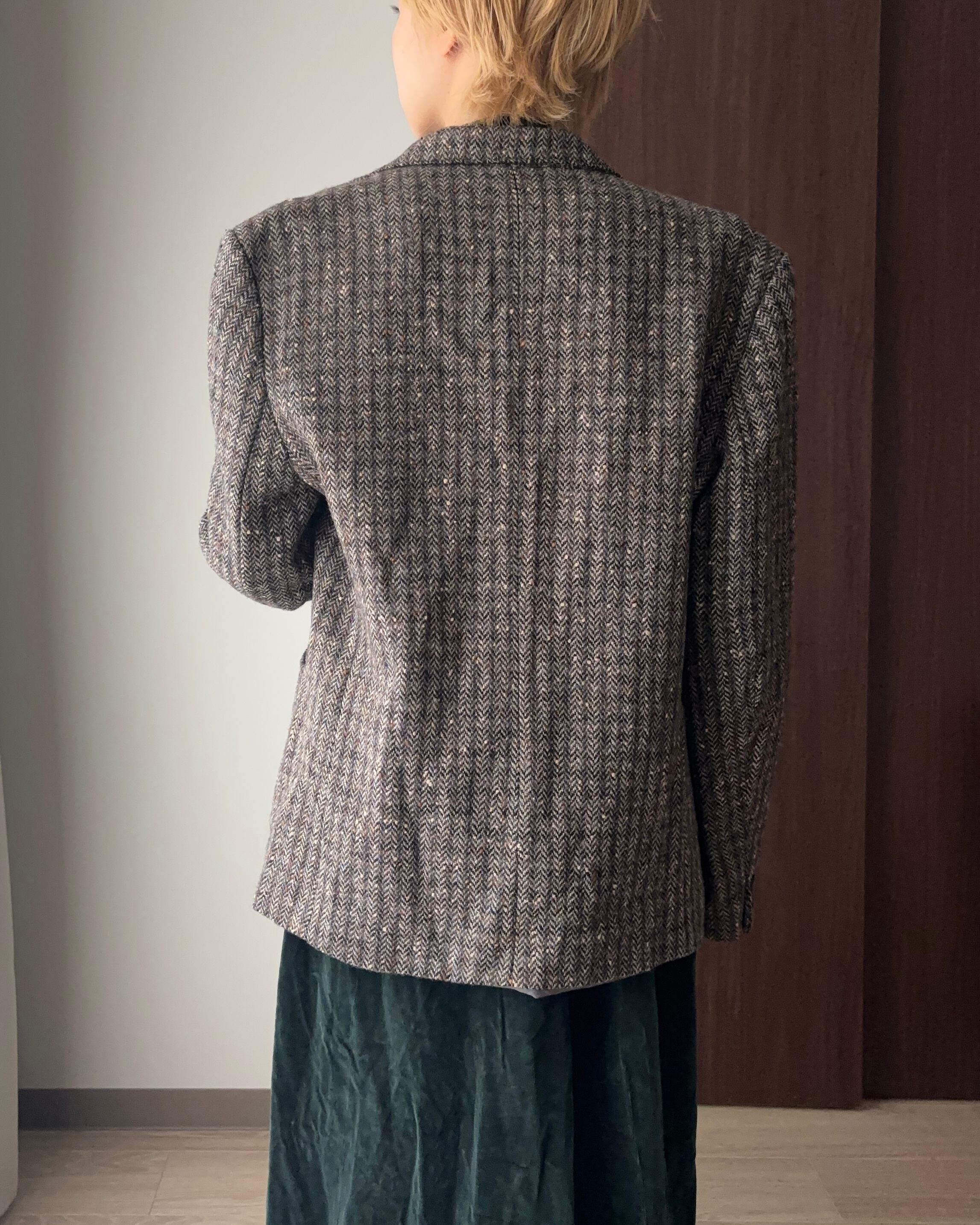 フランス製のウールジャケットは、チャコールグレーをベースに、テラコッタ・ホワイト・ブルーの糸がミックスされた奥行きのあるヘリンボーン柄が魅力。