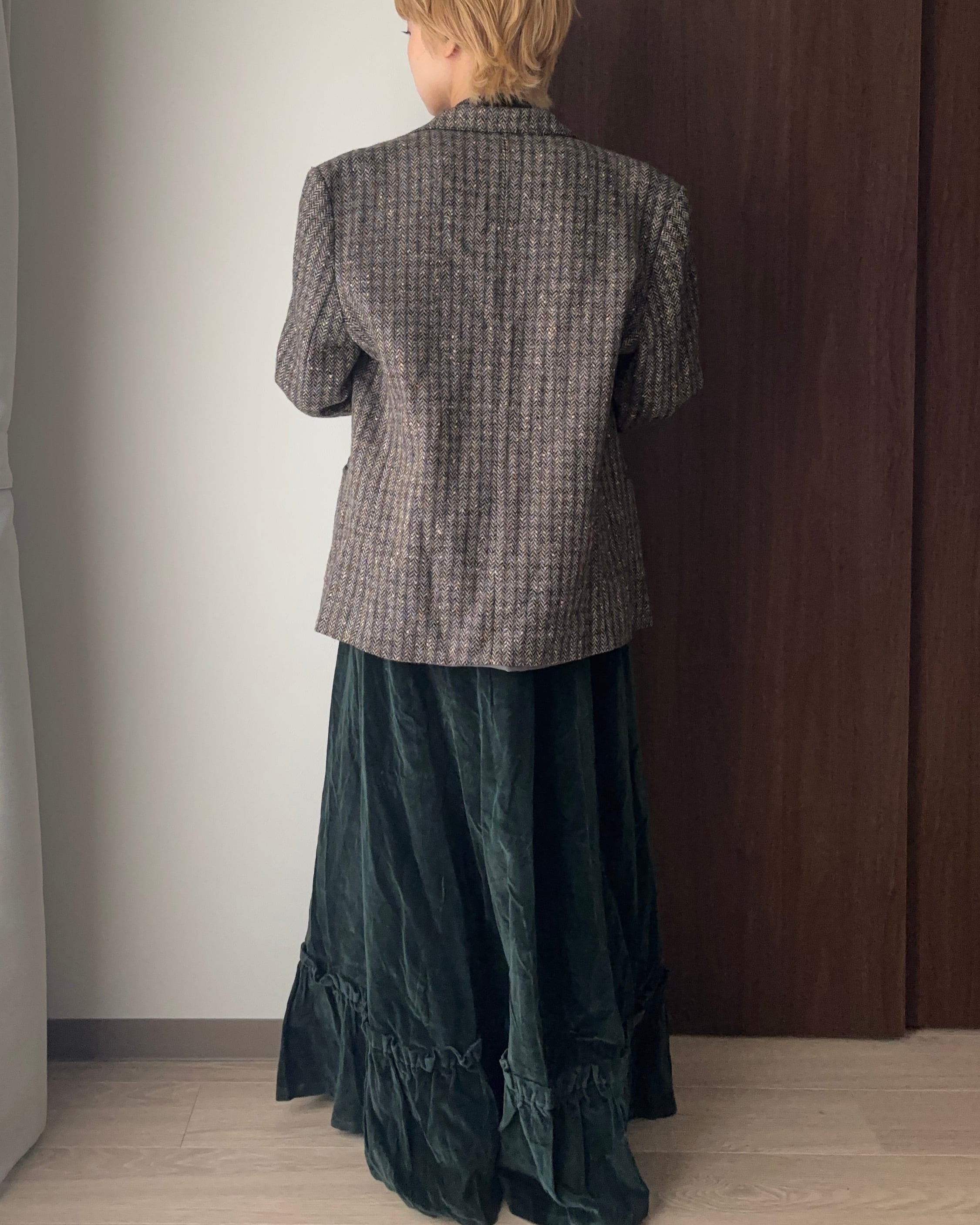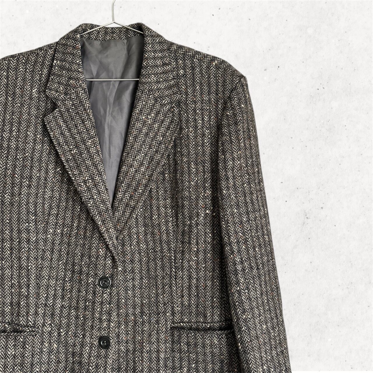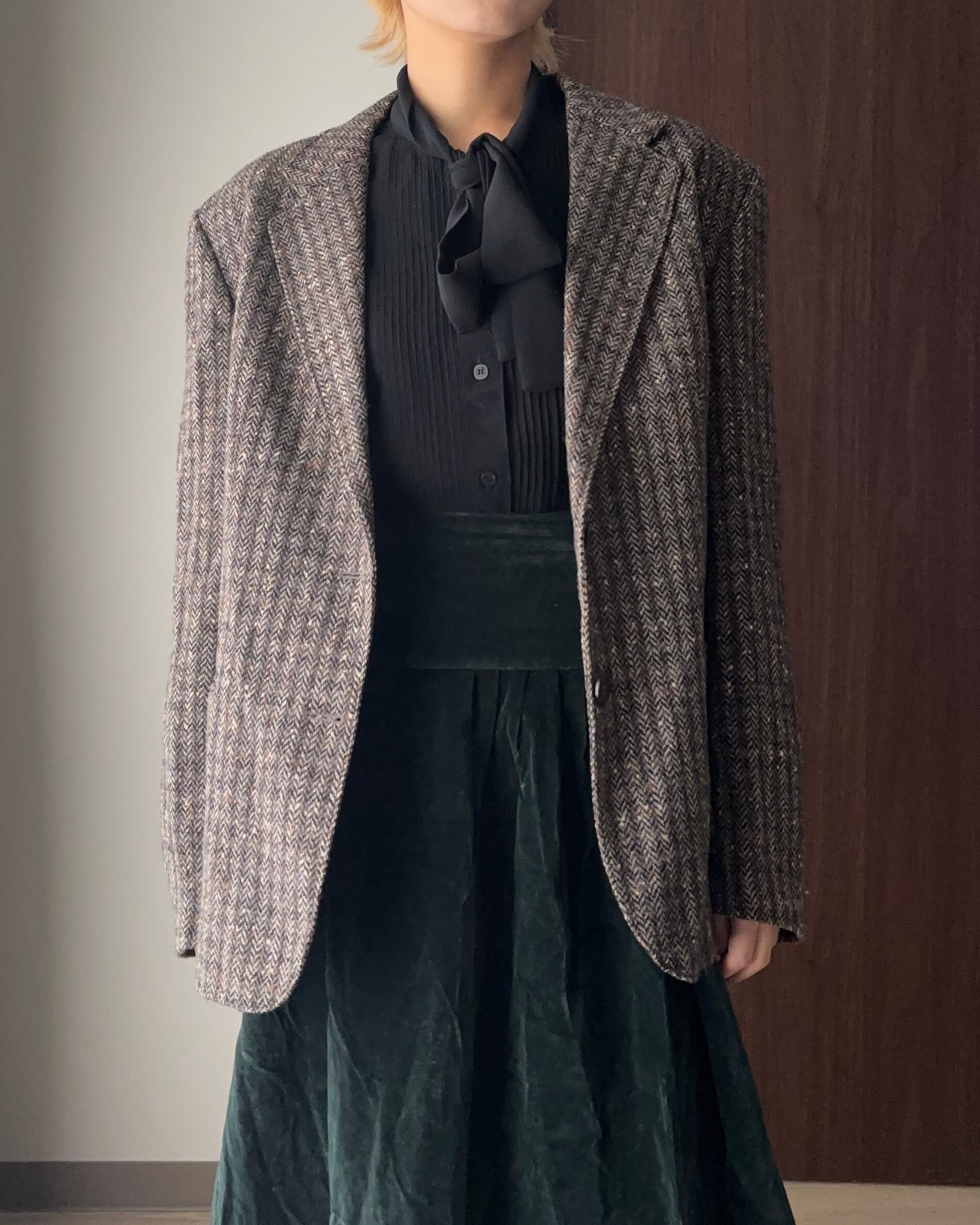 フランス製のウールジャケットは、チャコールグレーをベースに、テラコッタ・ホワイト・ブルーの糸がミックスされた奥行きのあるヘリンボーン柄が魅力。