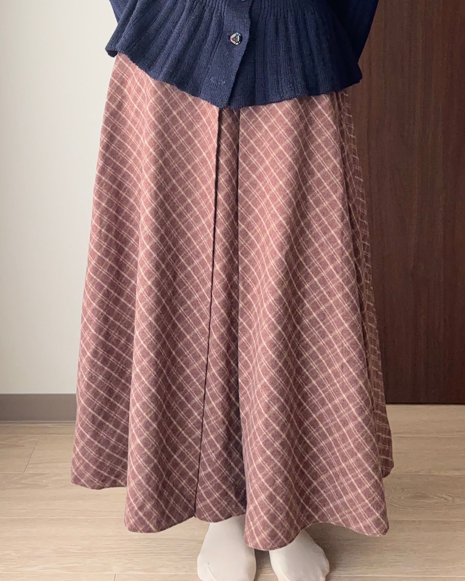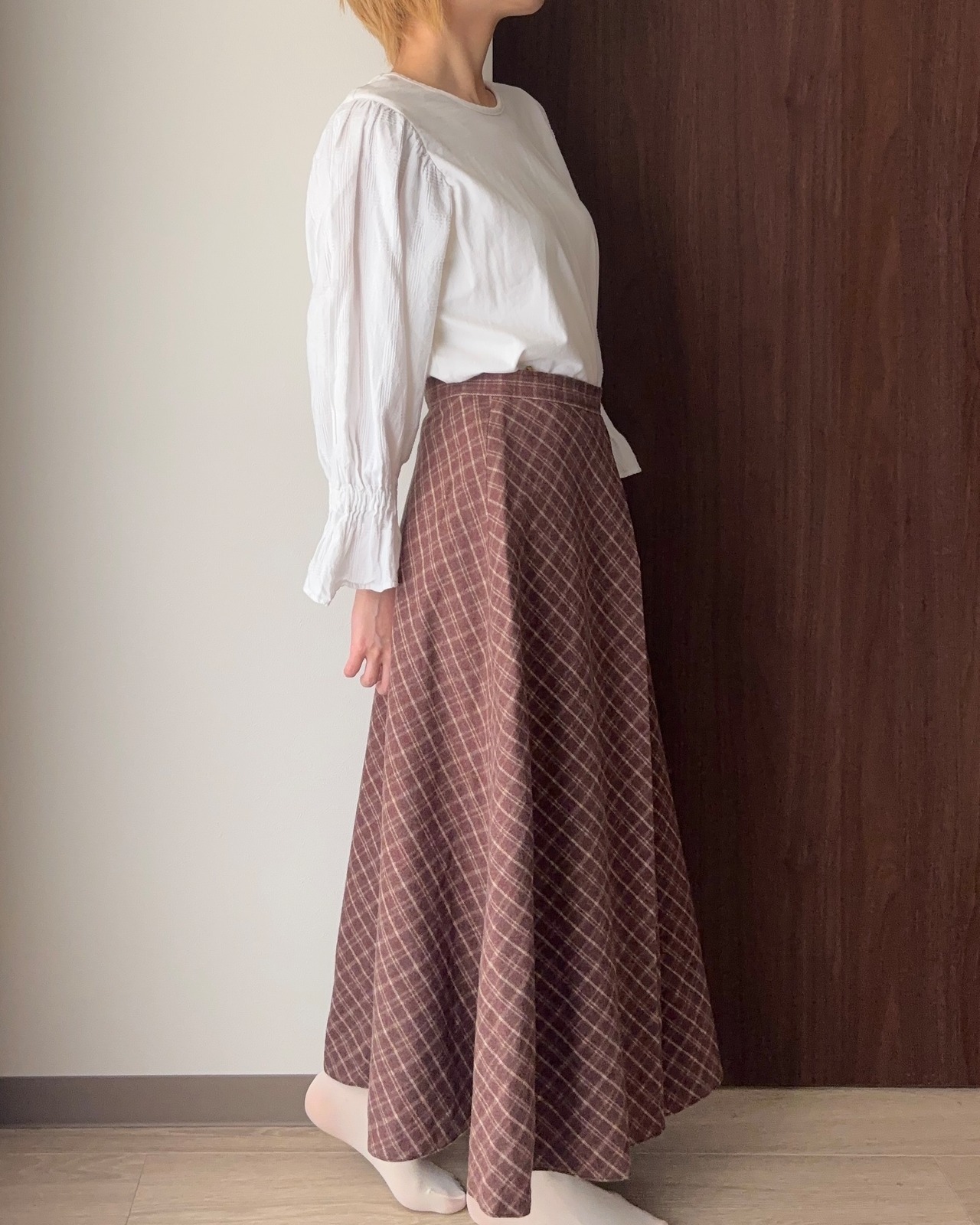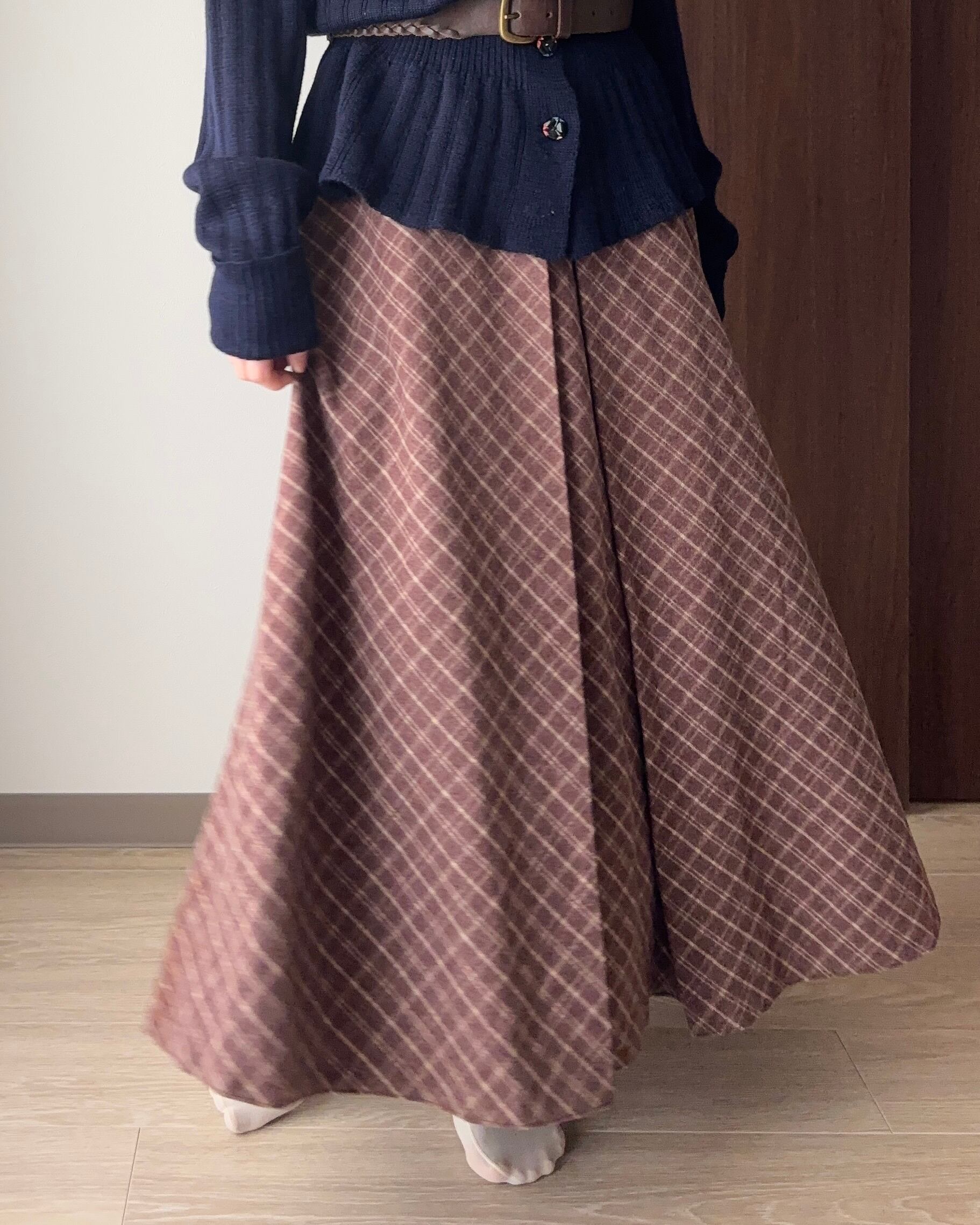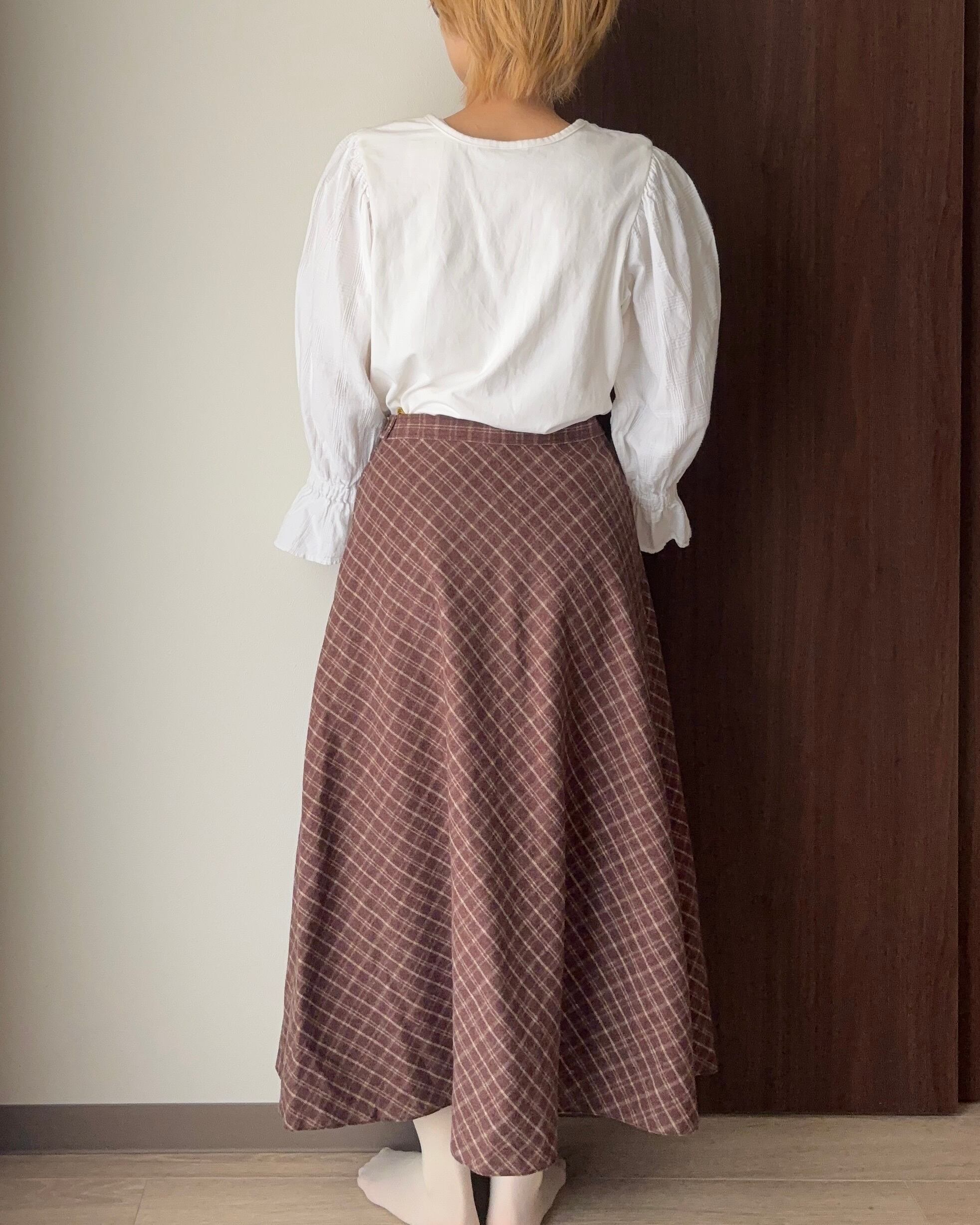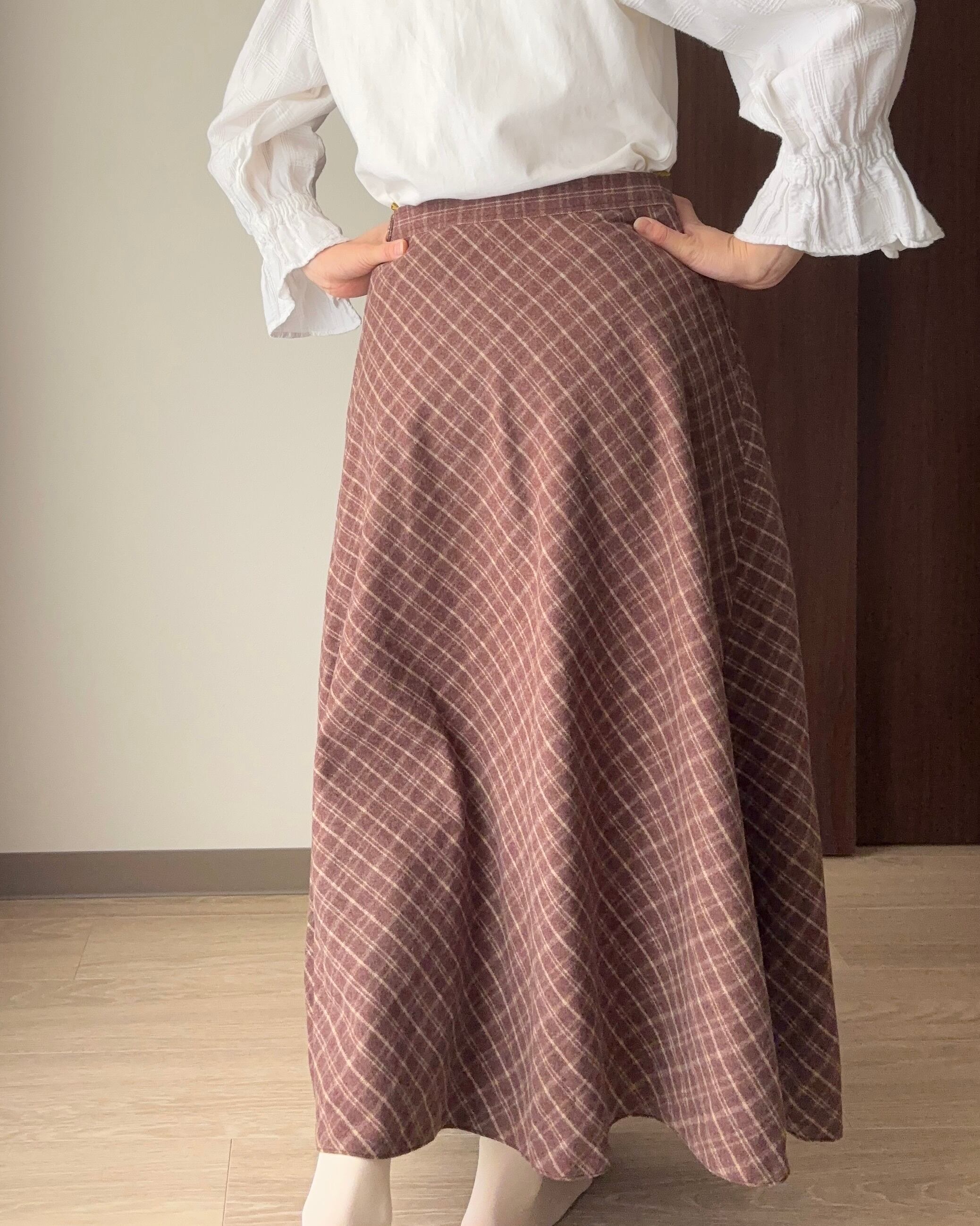 ウールのチェックスカートは、クラシカルで上品な雰囲気漂う一着。