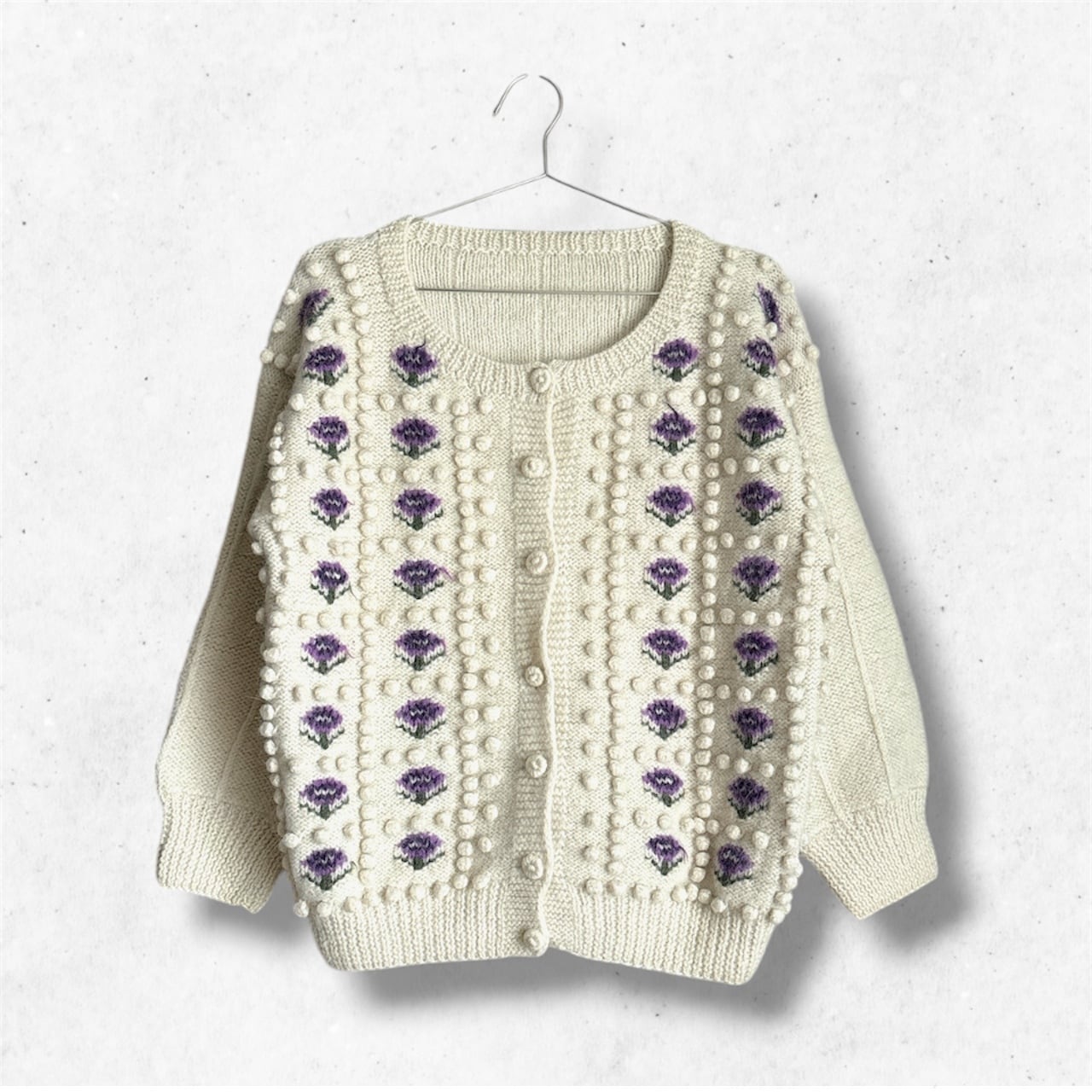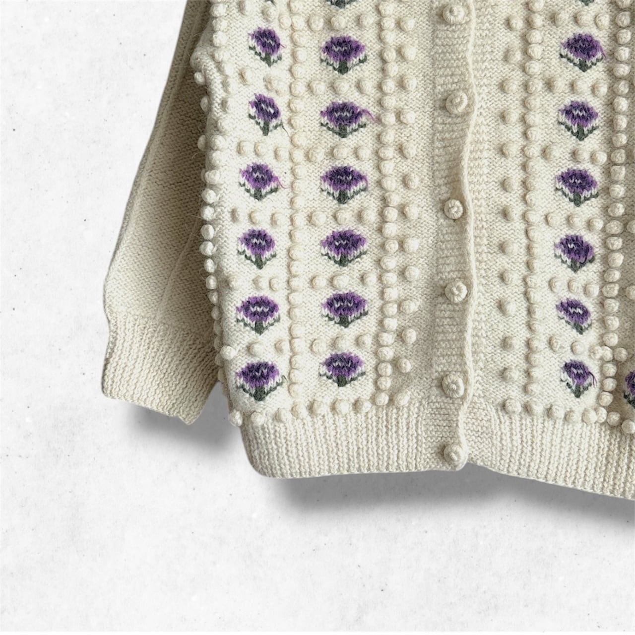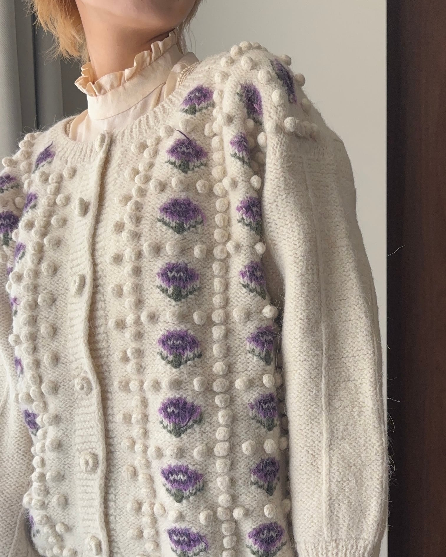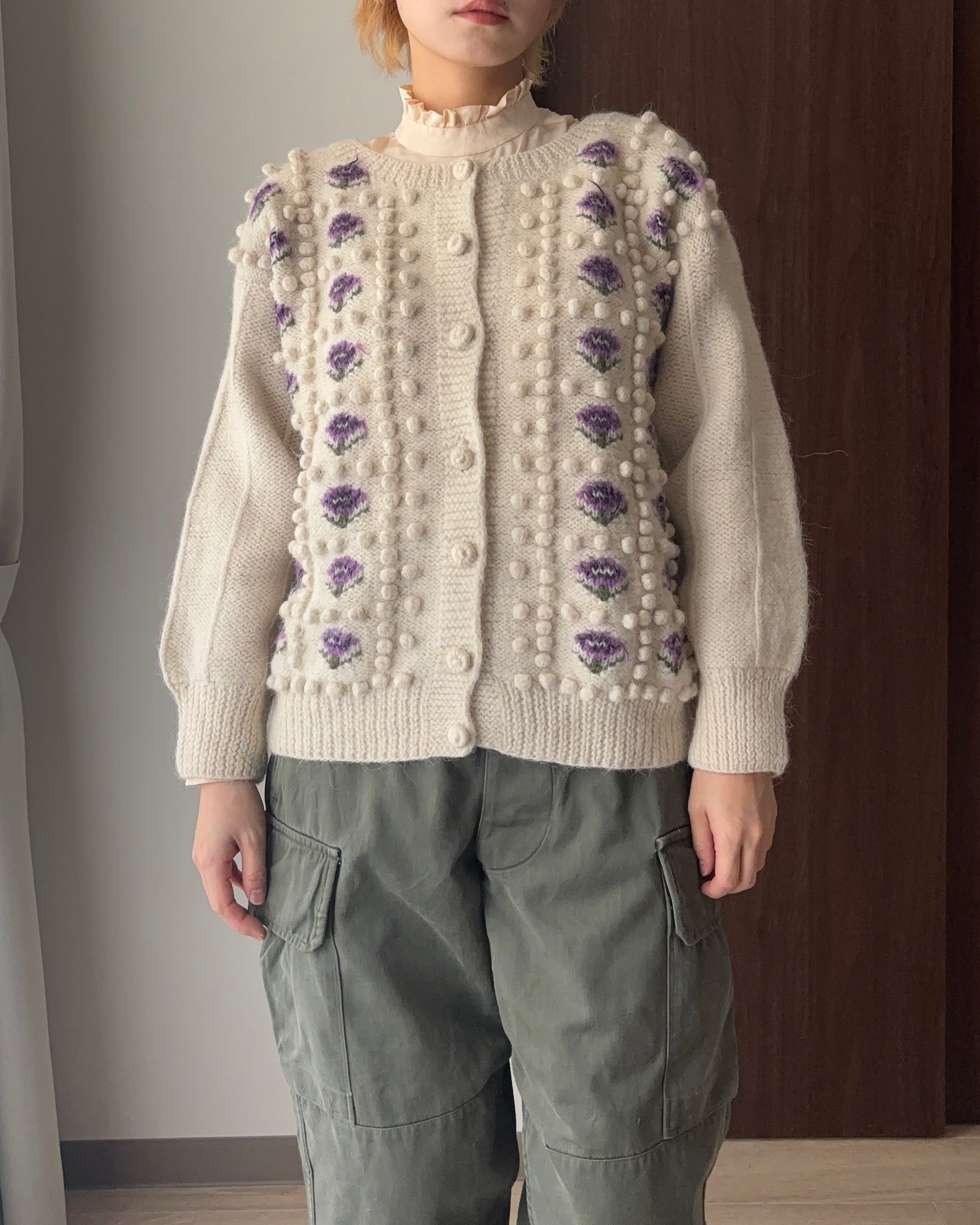 手編みの花柄ニットカーディガン。