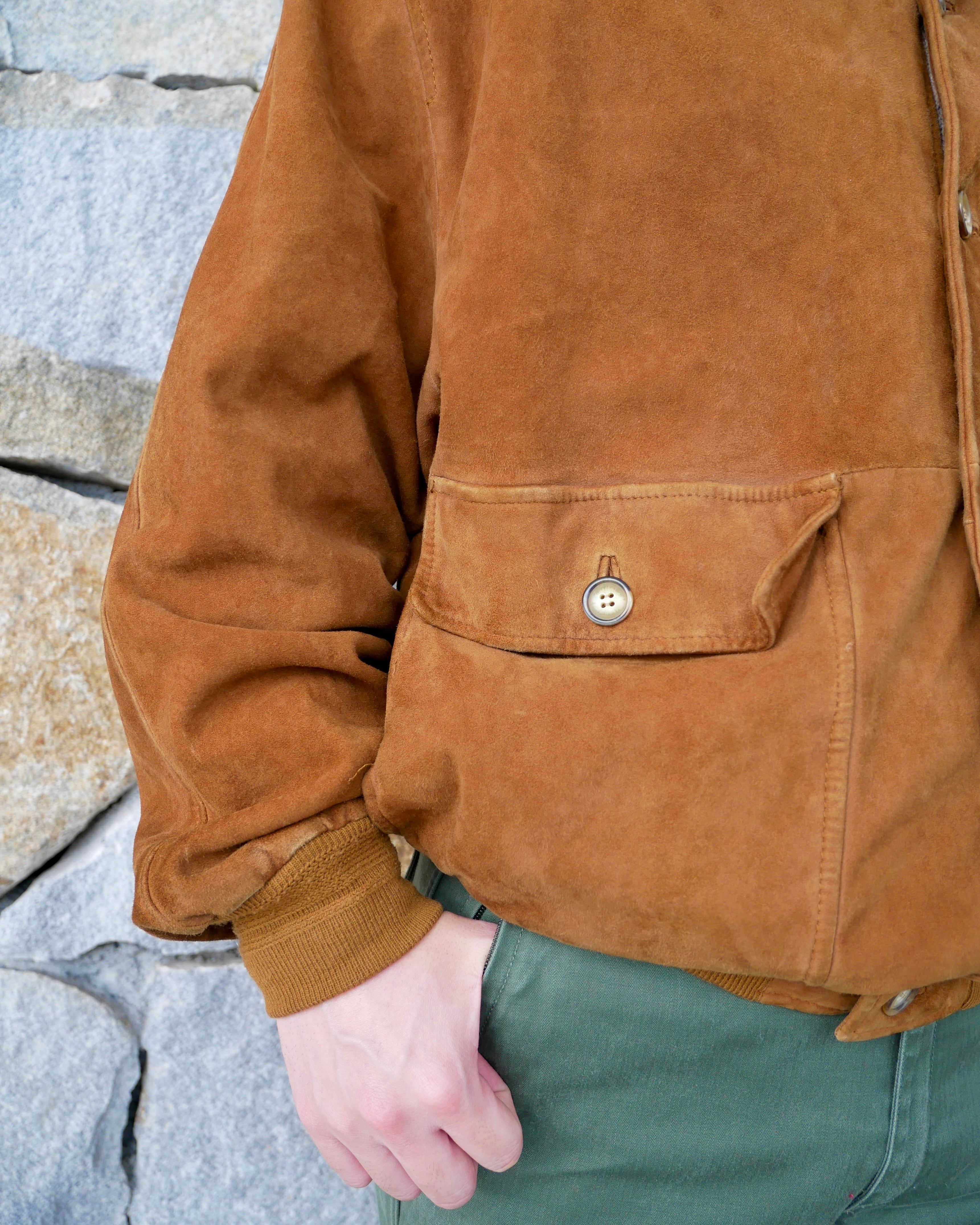 ボタンはレザーと馴染むマーブル柄で統一され、上品ながらも控えめな存在感。