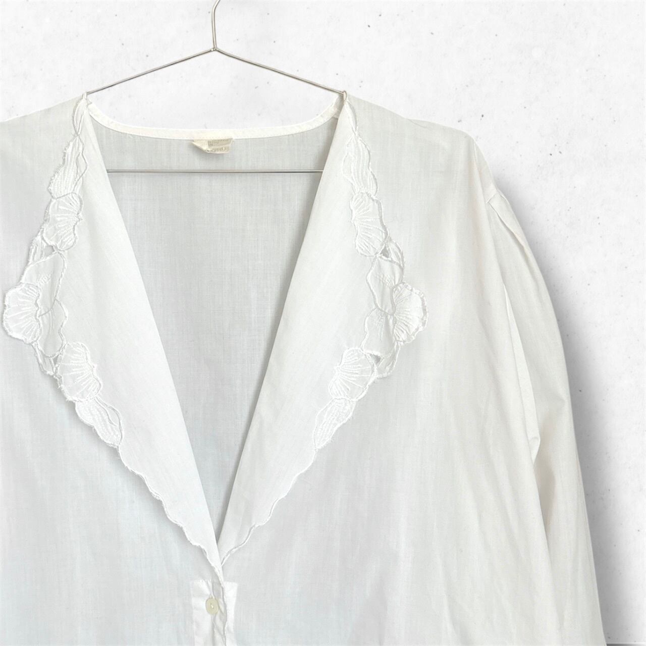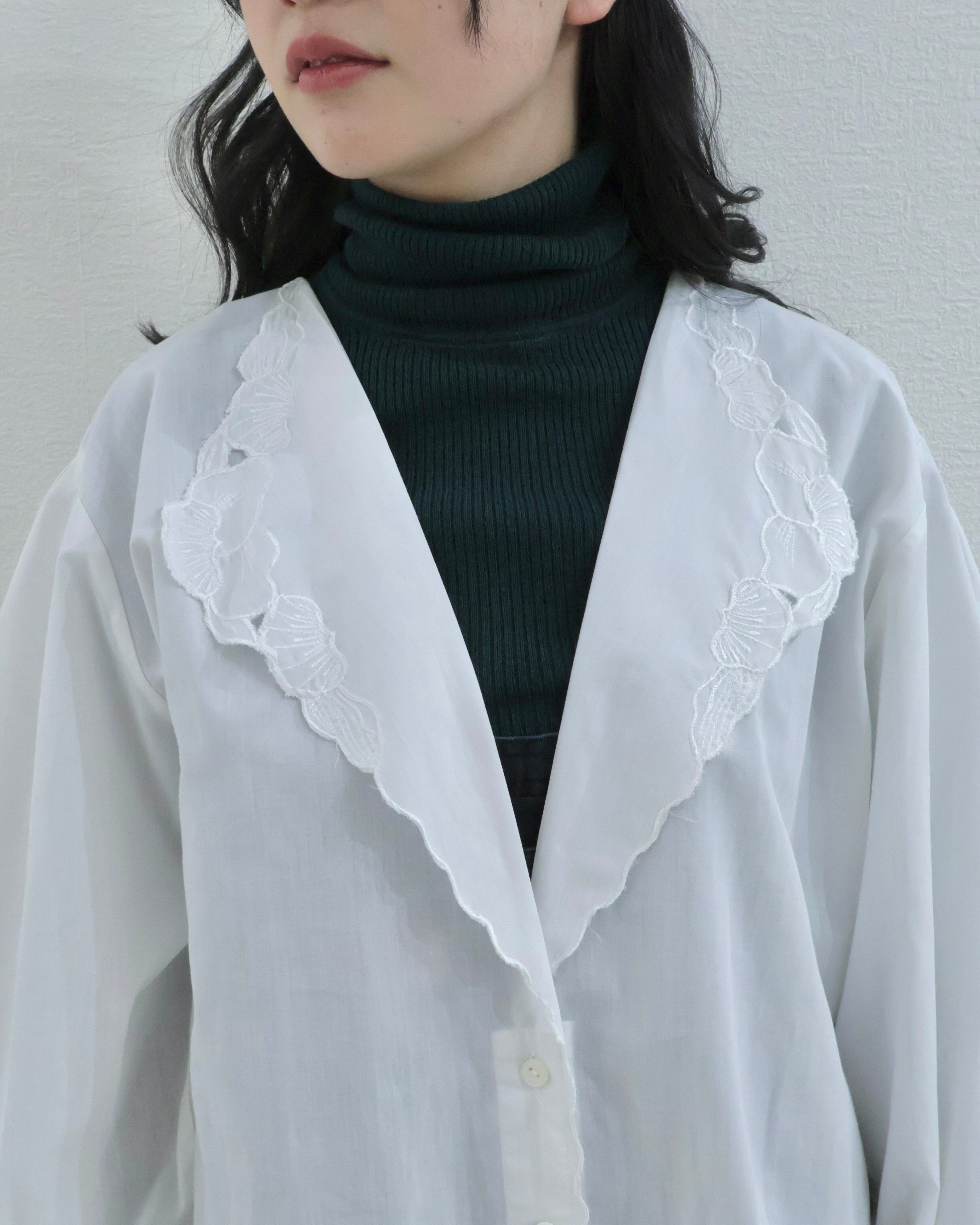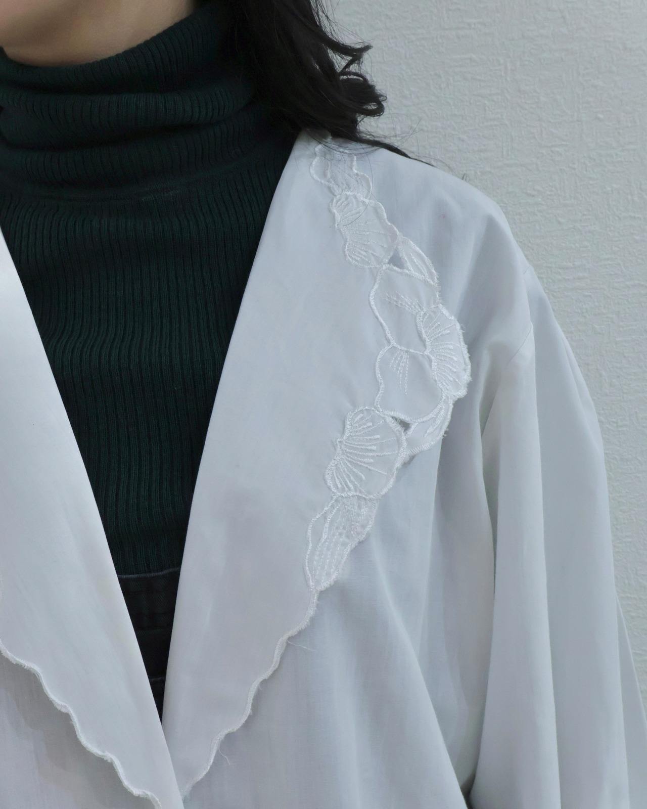 襟元は大振りで、花びらのようなレース刺繍があしらわれた印象的なデザイン。