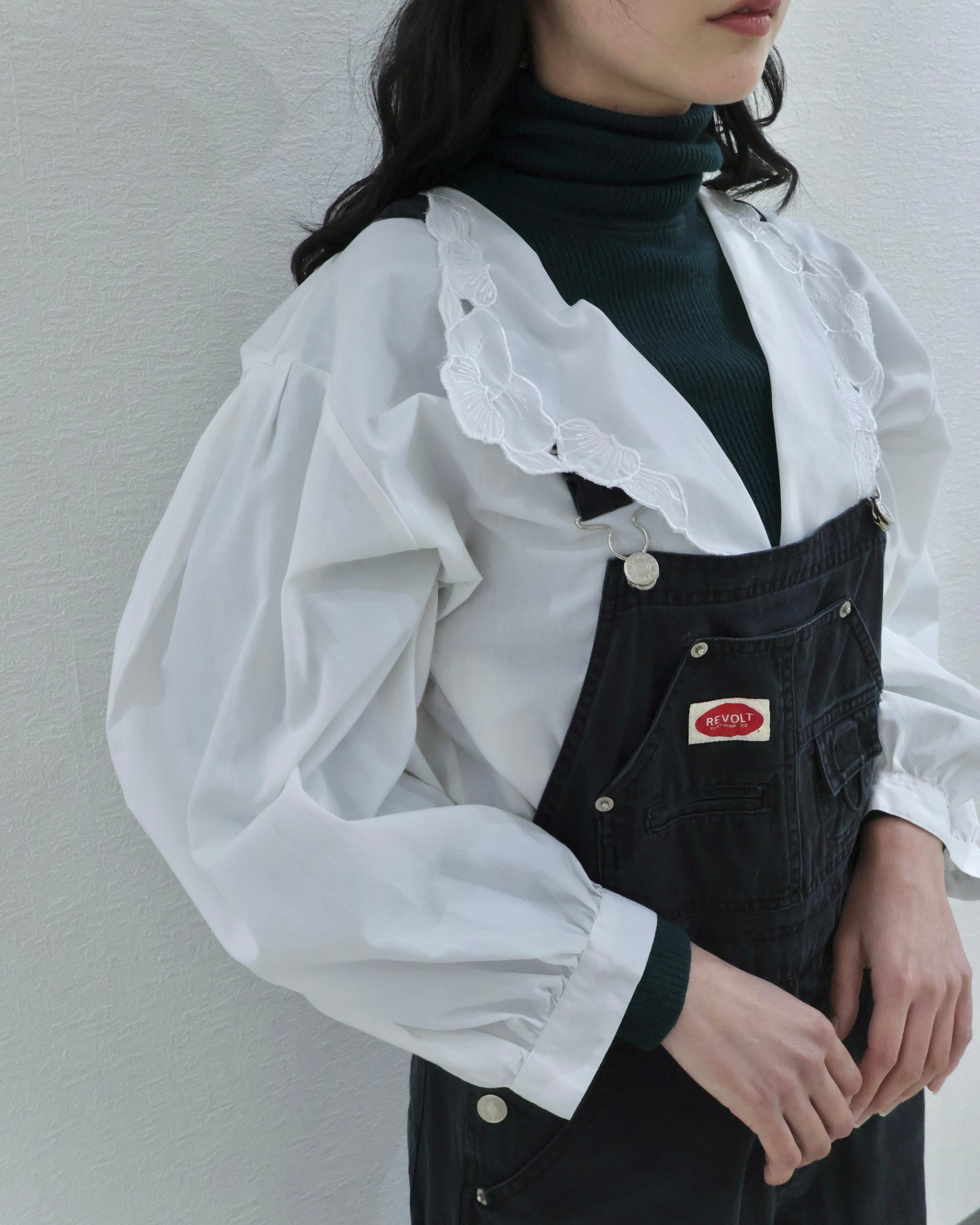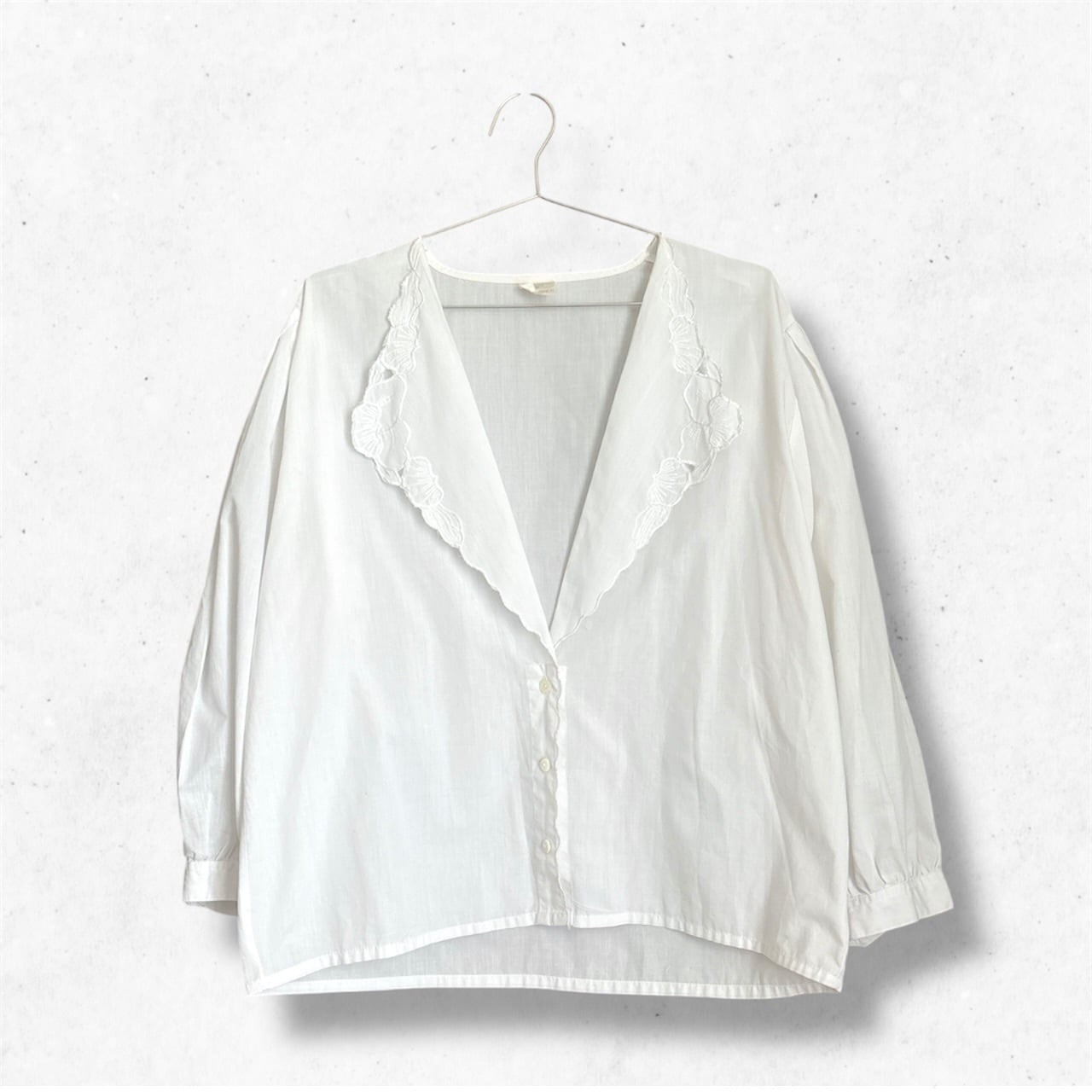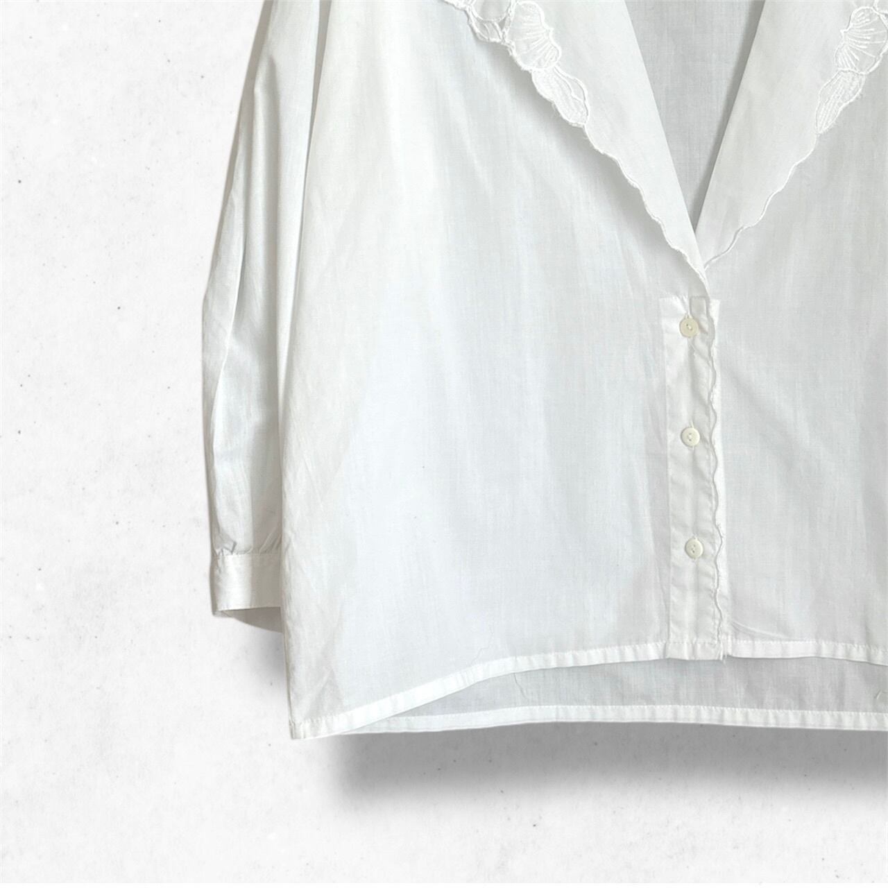 襟元は大振りで、花びらのようなレース刺繍があしらわれた印象的なデザイン。