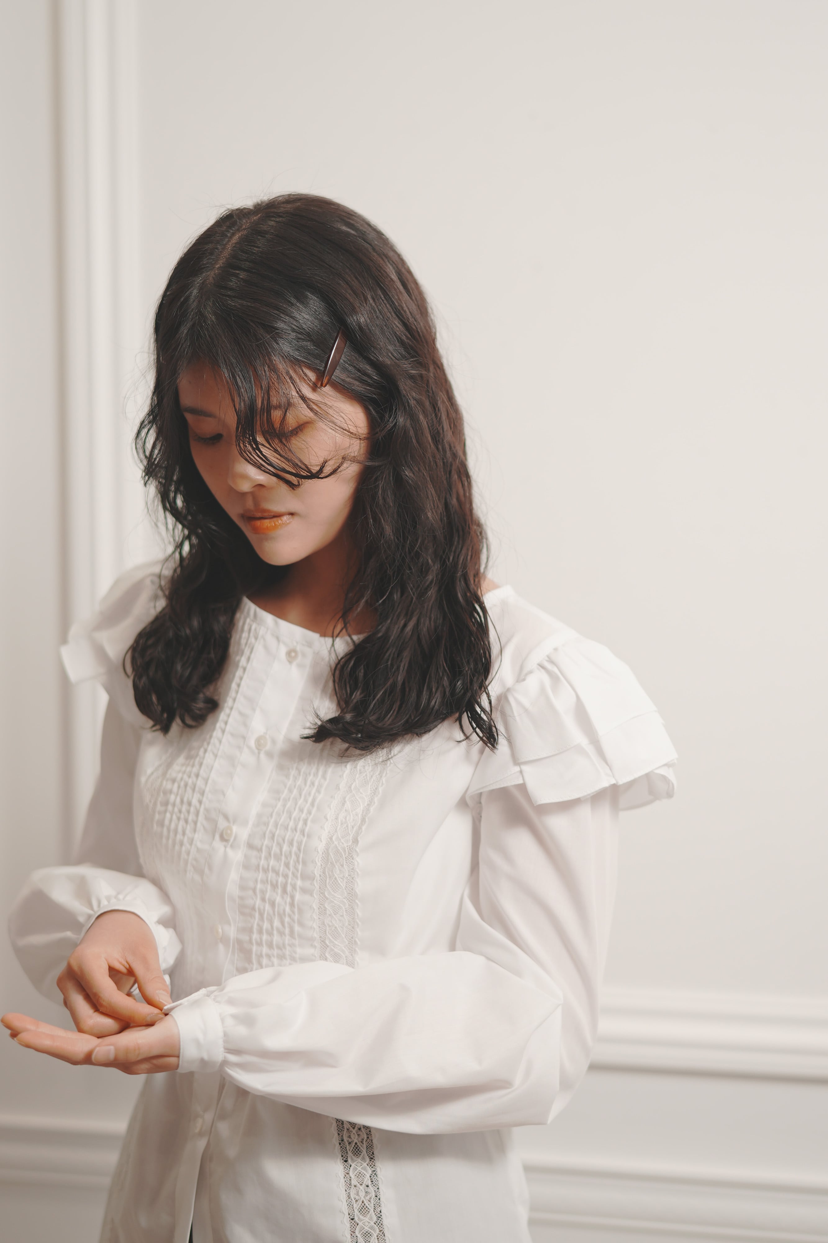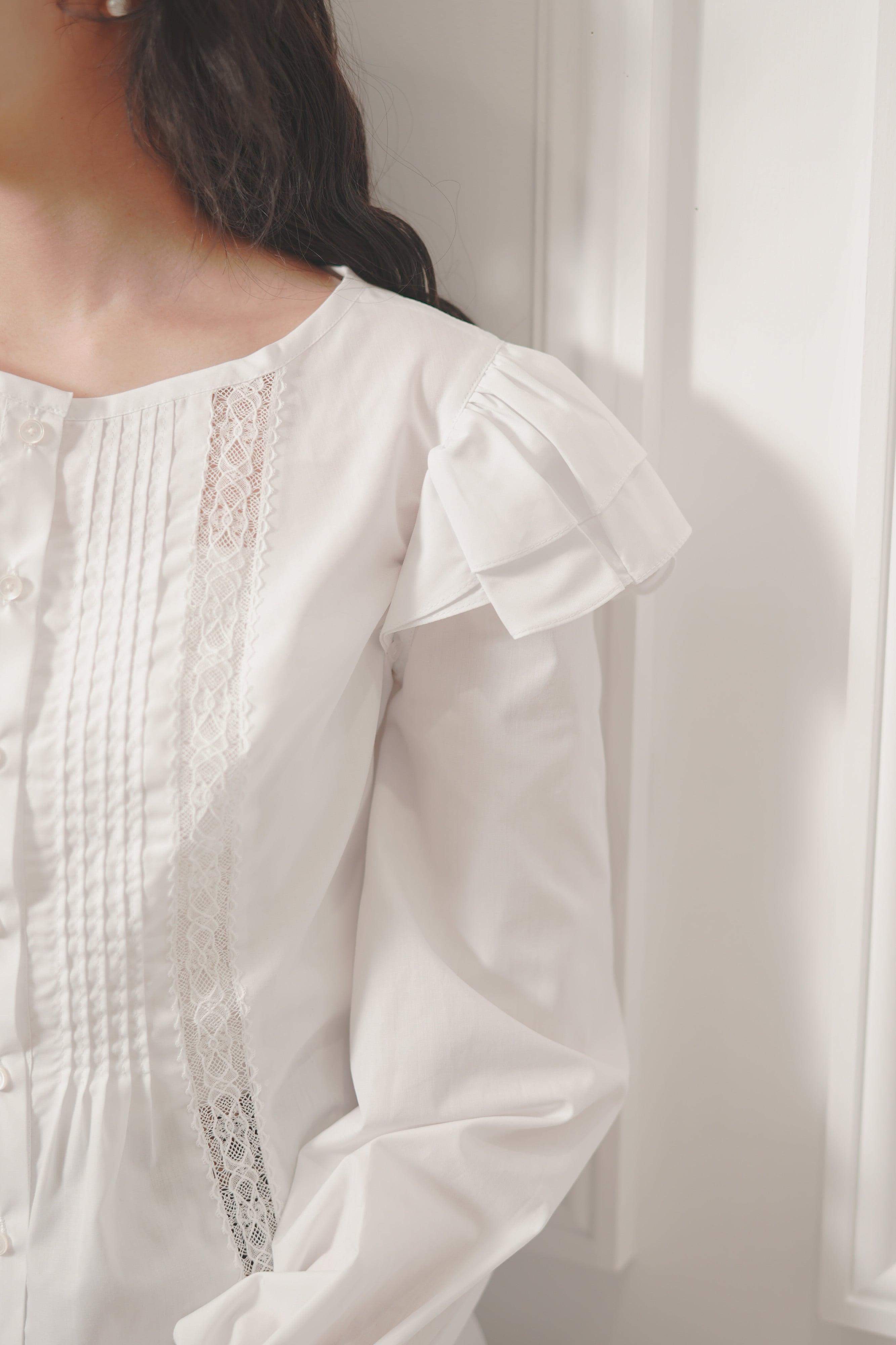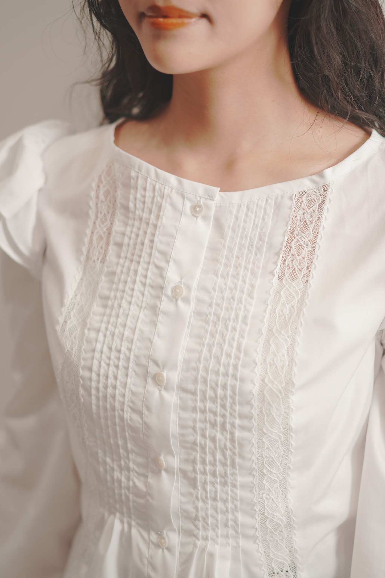 デザインには、レースとピンタックを取り入れ、