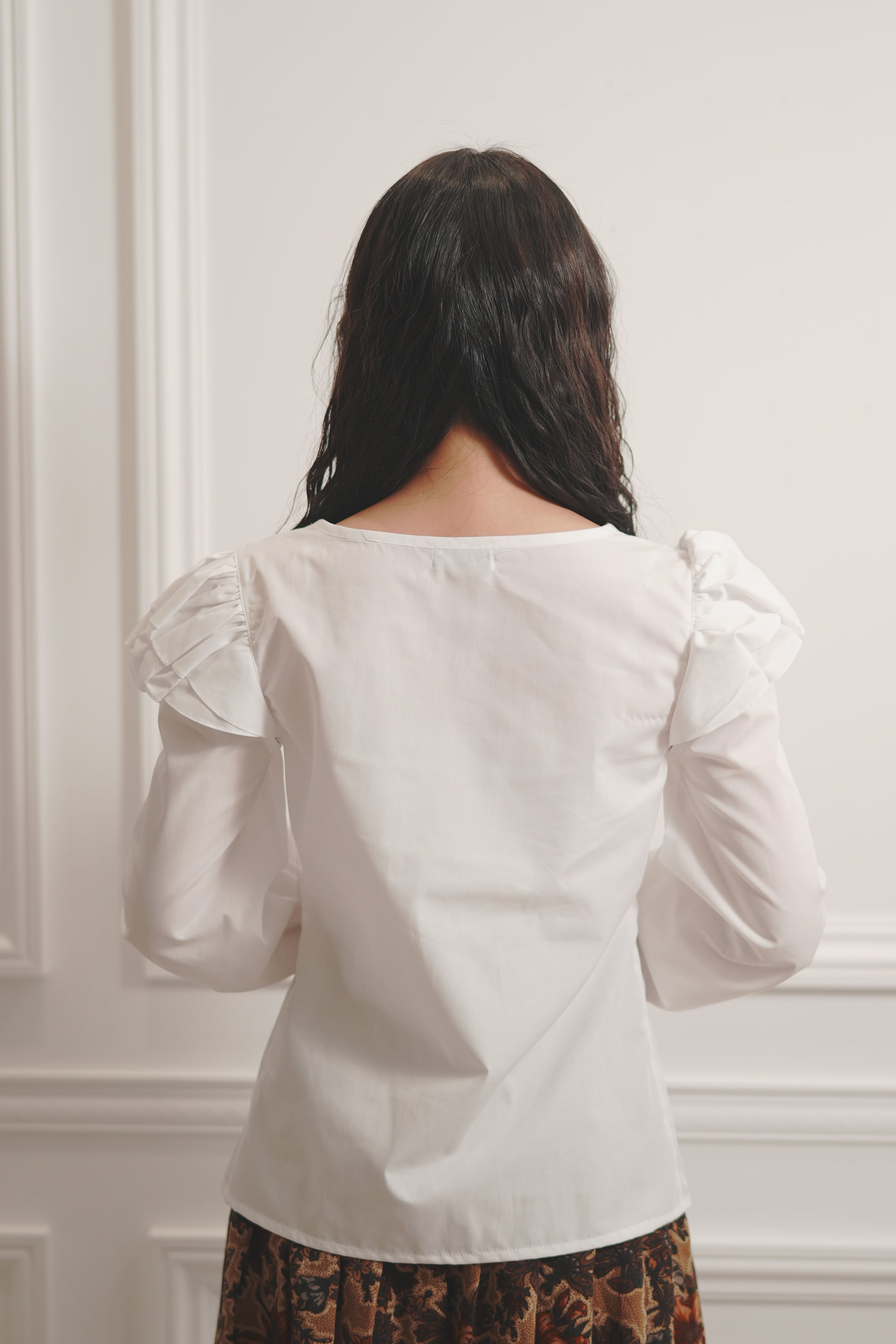 肩のフリルは腕のラインに沿うデザイン。