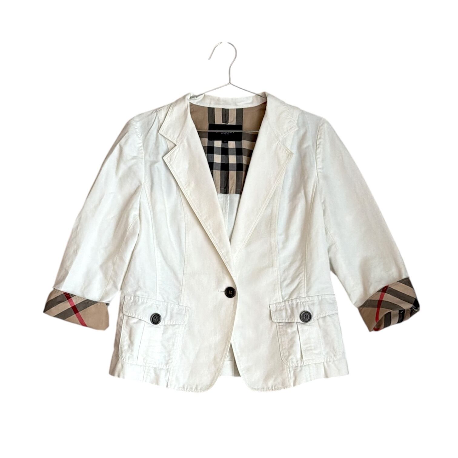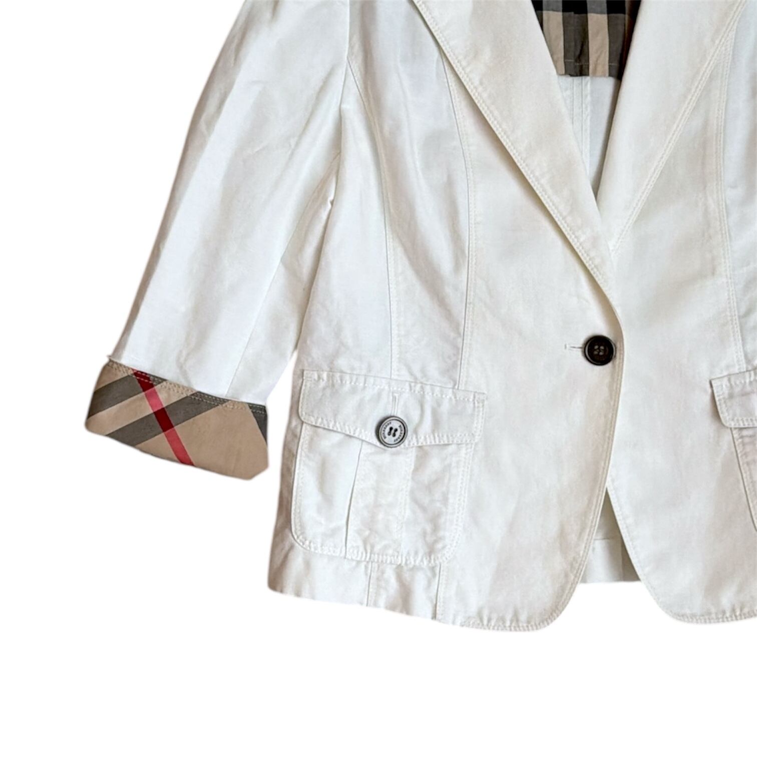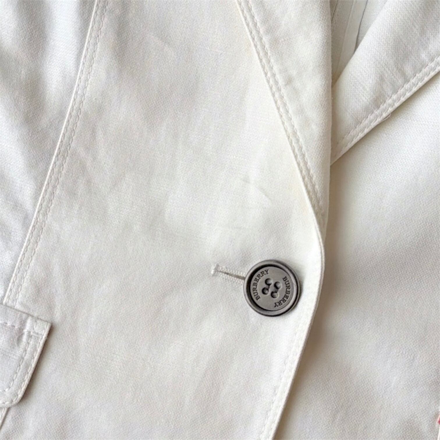 Burberryのテーラードジャケットは、春らしい軽やかなホワイトカラーが魅力の一着。