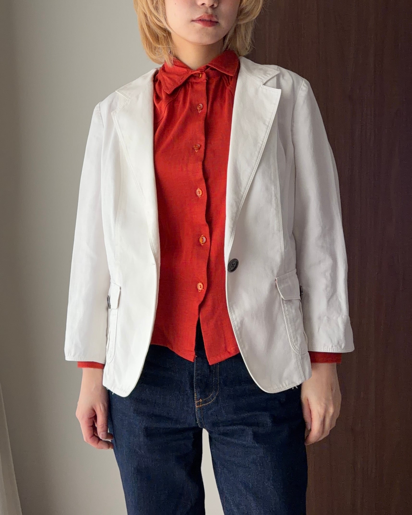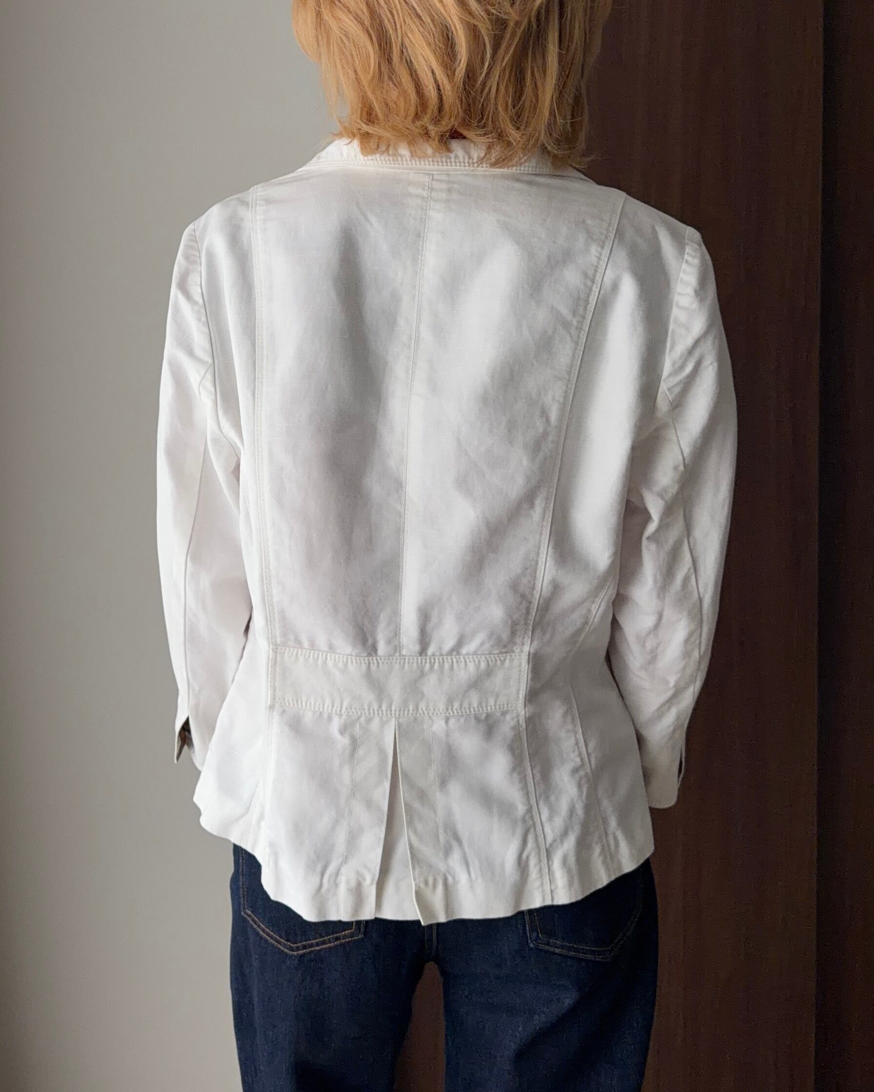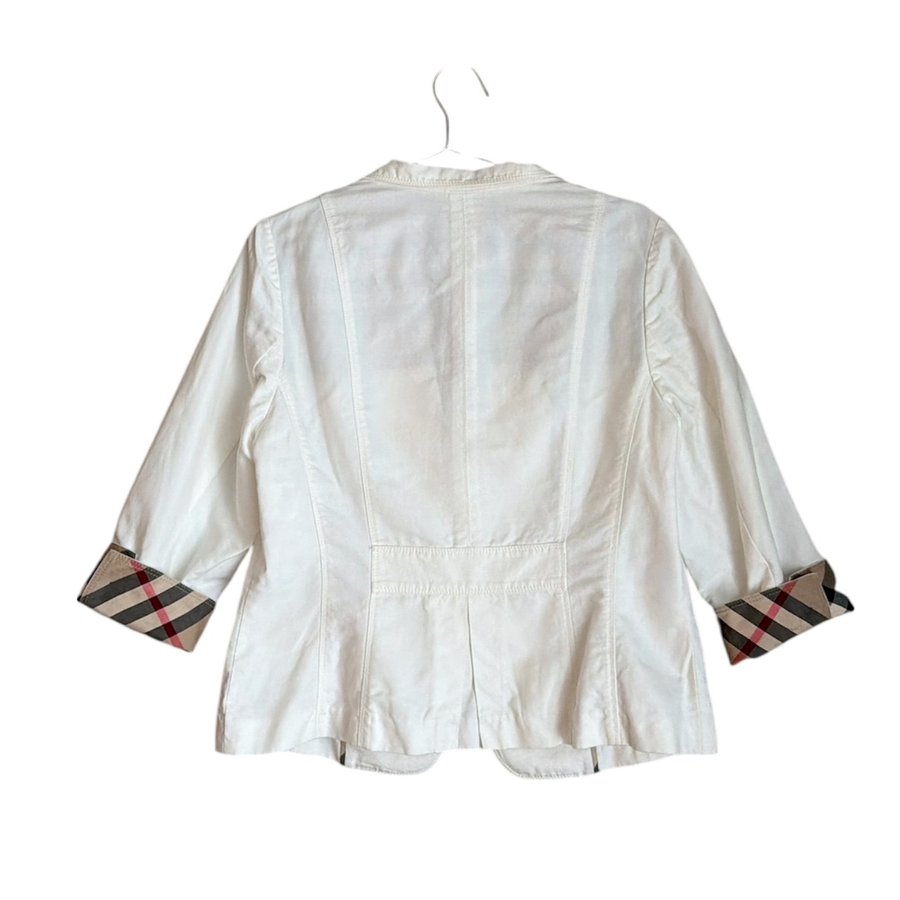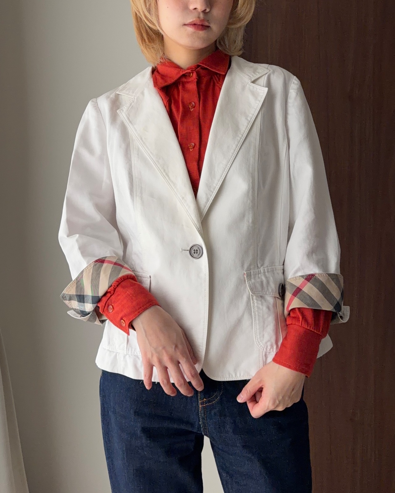 Burberryのテーラードジャケットは、春らしい軽やかなホワイトカラーが魅力の一着。