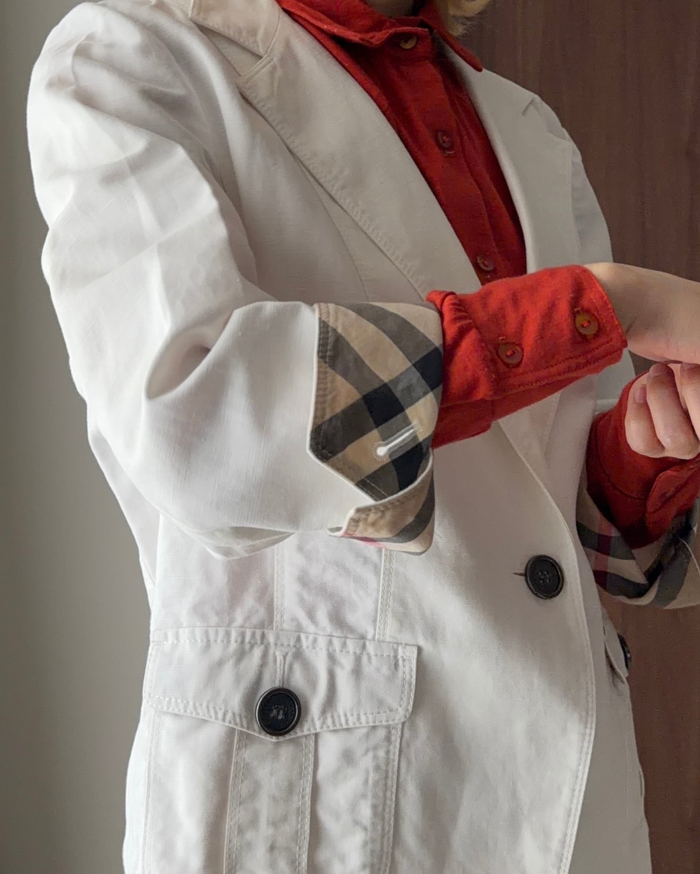 裏地はブランドらしいチェック柄で、袖を折り返してちらっと見せるスタイリングもおすすめ。