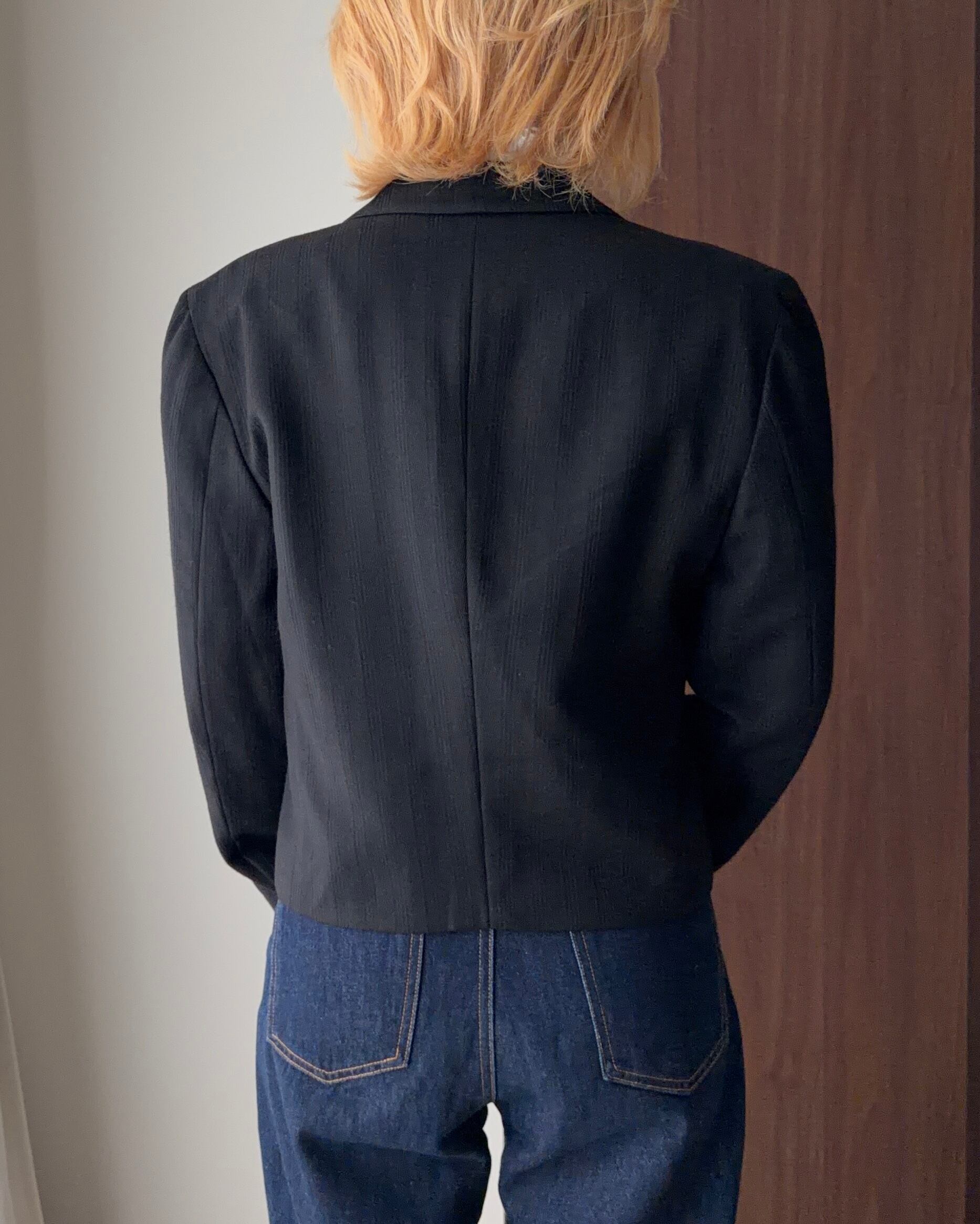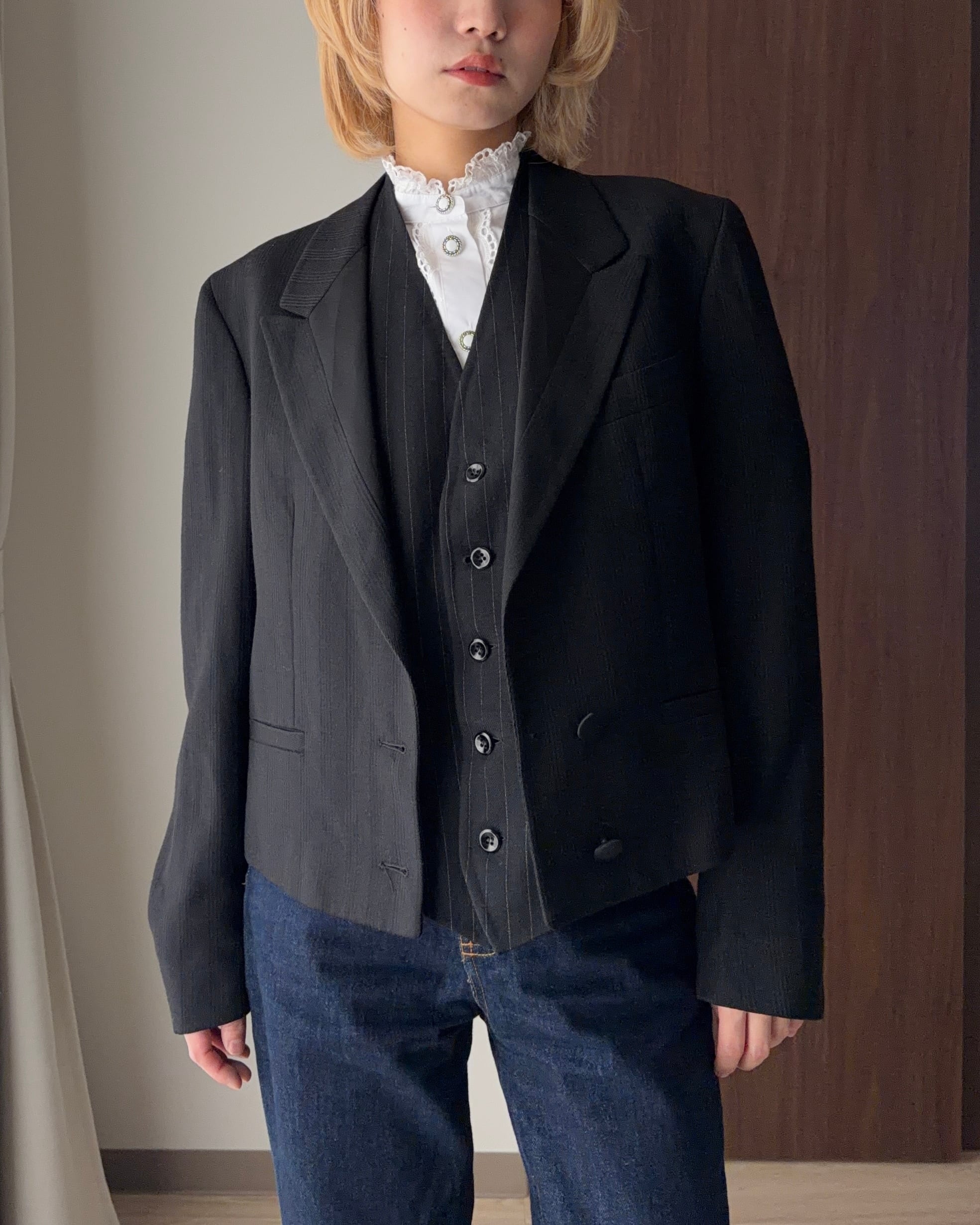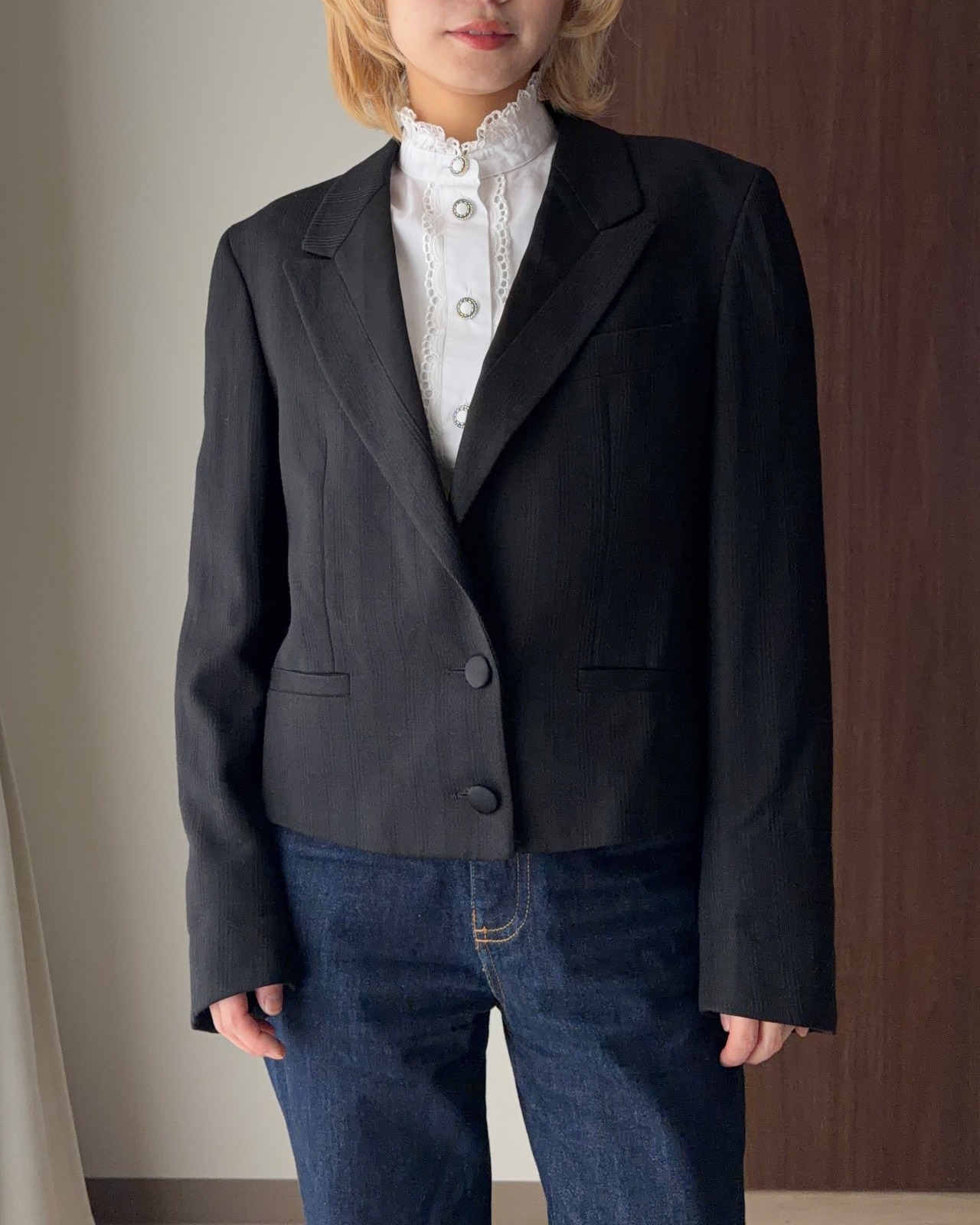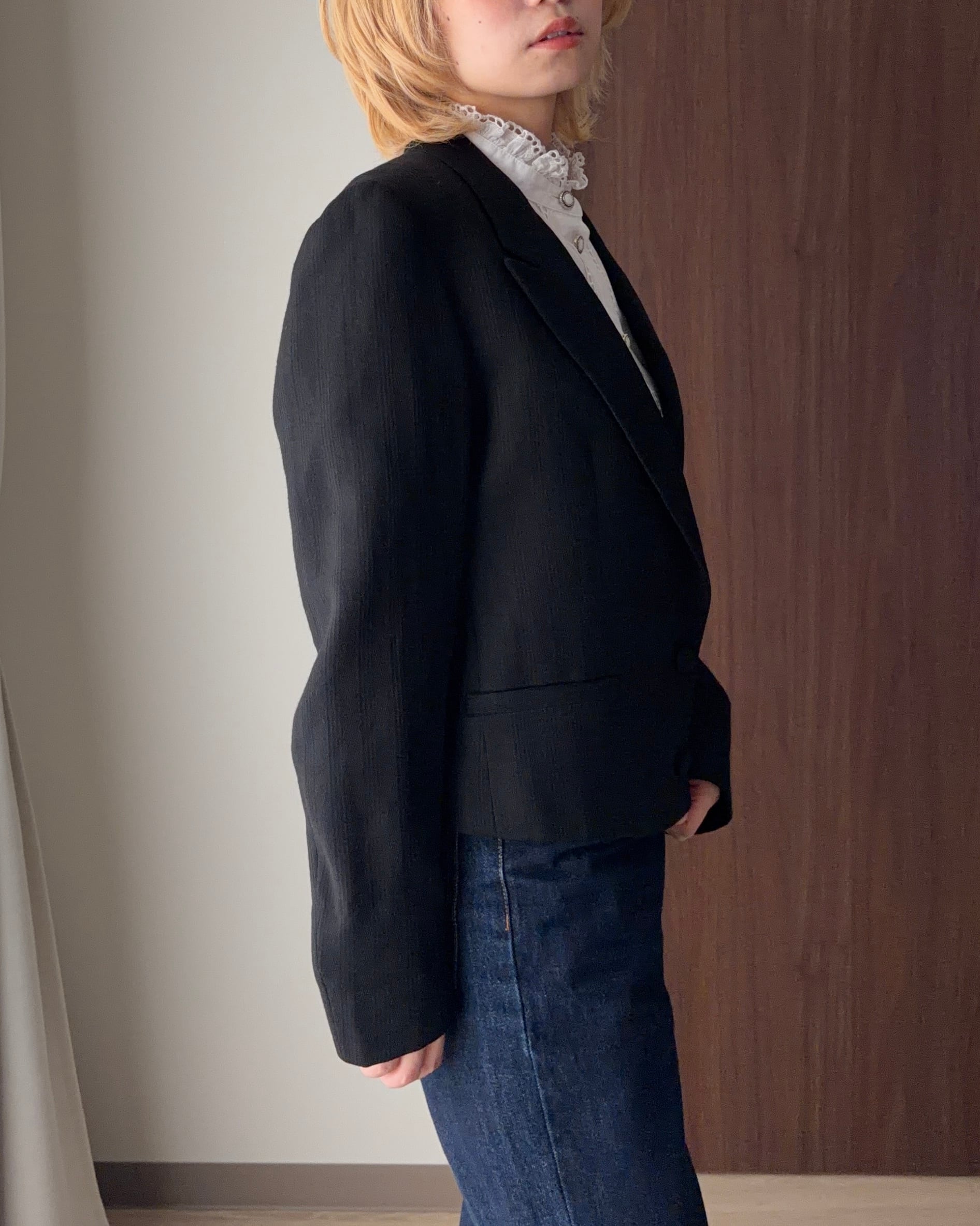 その美学がしっかりと息づいたこのテーラードジャケットは、ただの“黒ジャケット”では終わらない、細部にまでこだわり抜かれた逸品です。