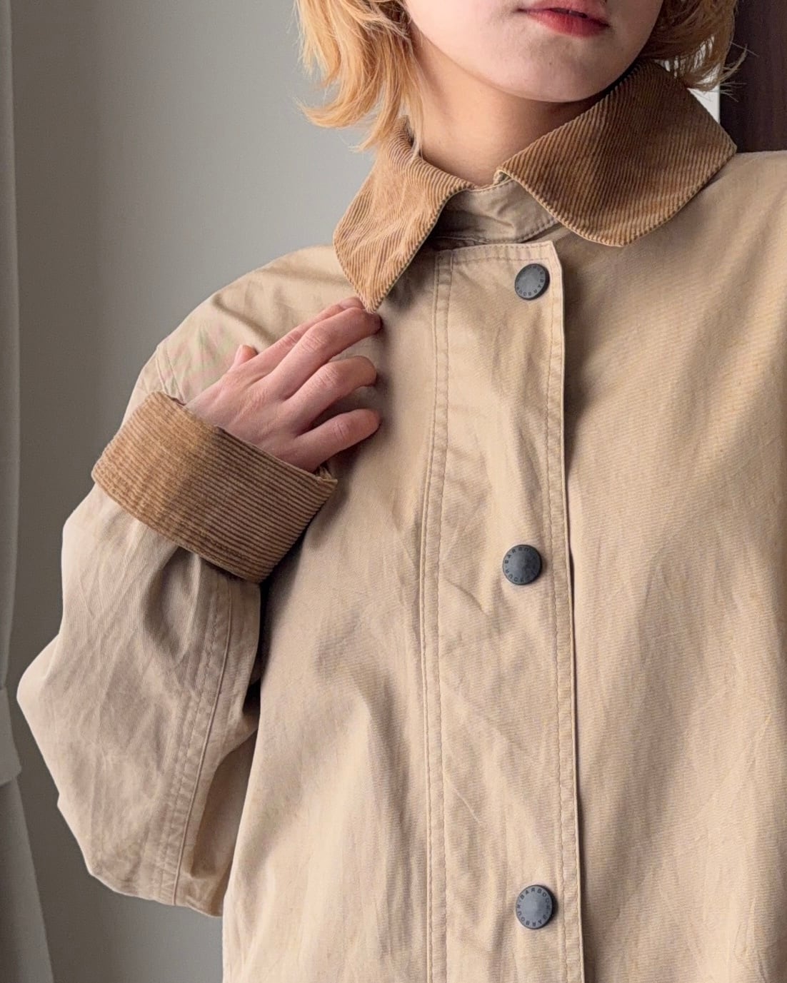 襟と袖のスウェード切り替えがさりげないアクセントとなり、裏地のチェック柄が見えない部分までこだわりを感じさせるデザイン。