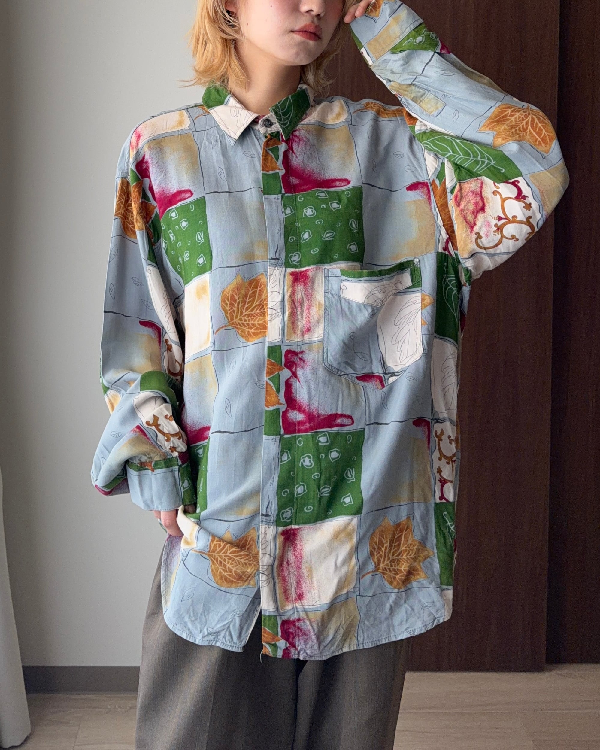 【AZZURRA CASUAL】イタリア製 パッチワーク柄シャツ/ くすみカラー カジュアル ヨーロッパ古着 euro vintage