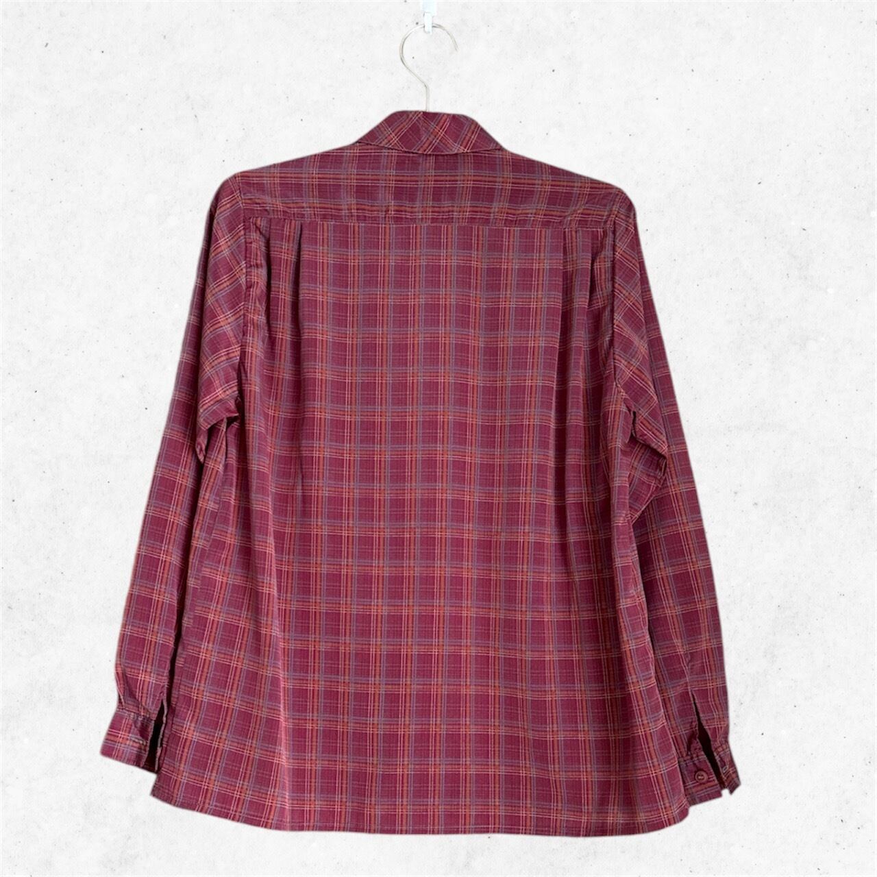 ベースはレッドに、オレンジ、ホワイト、ブルーのチェック柄が映える華やかなブラウスです。