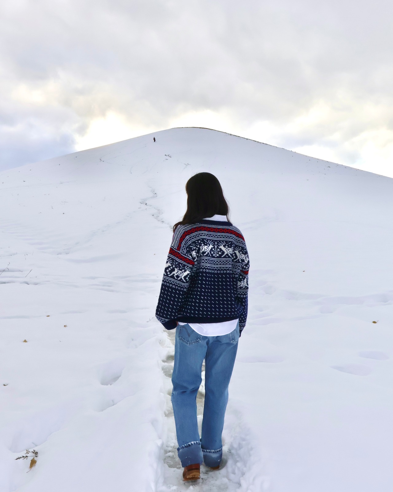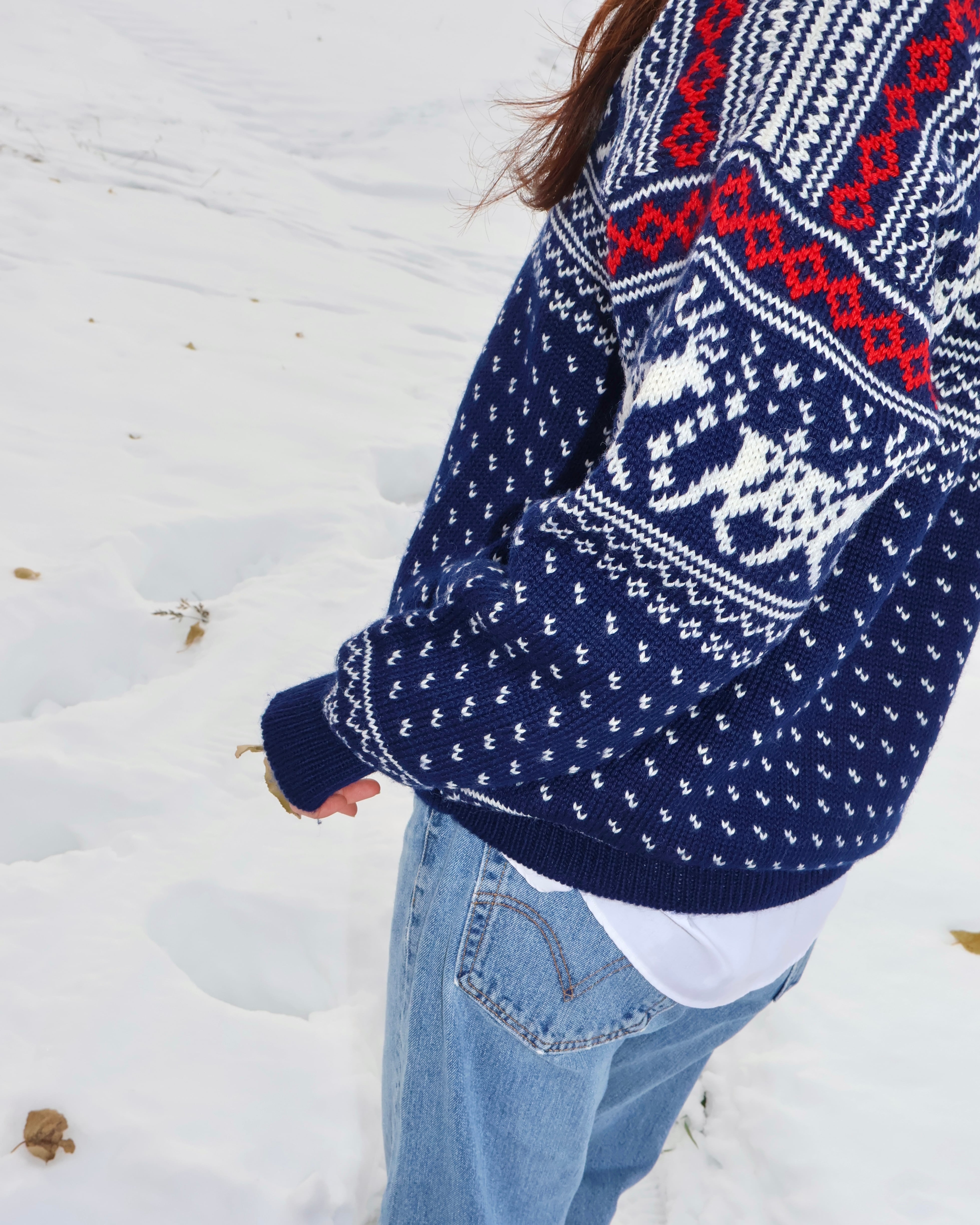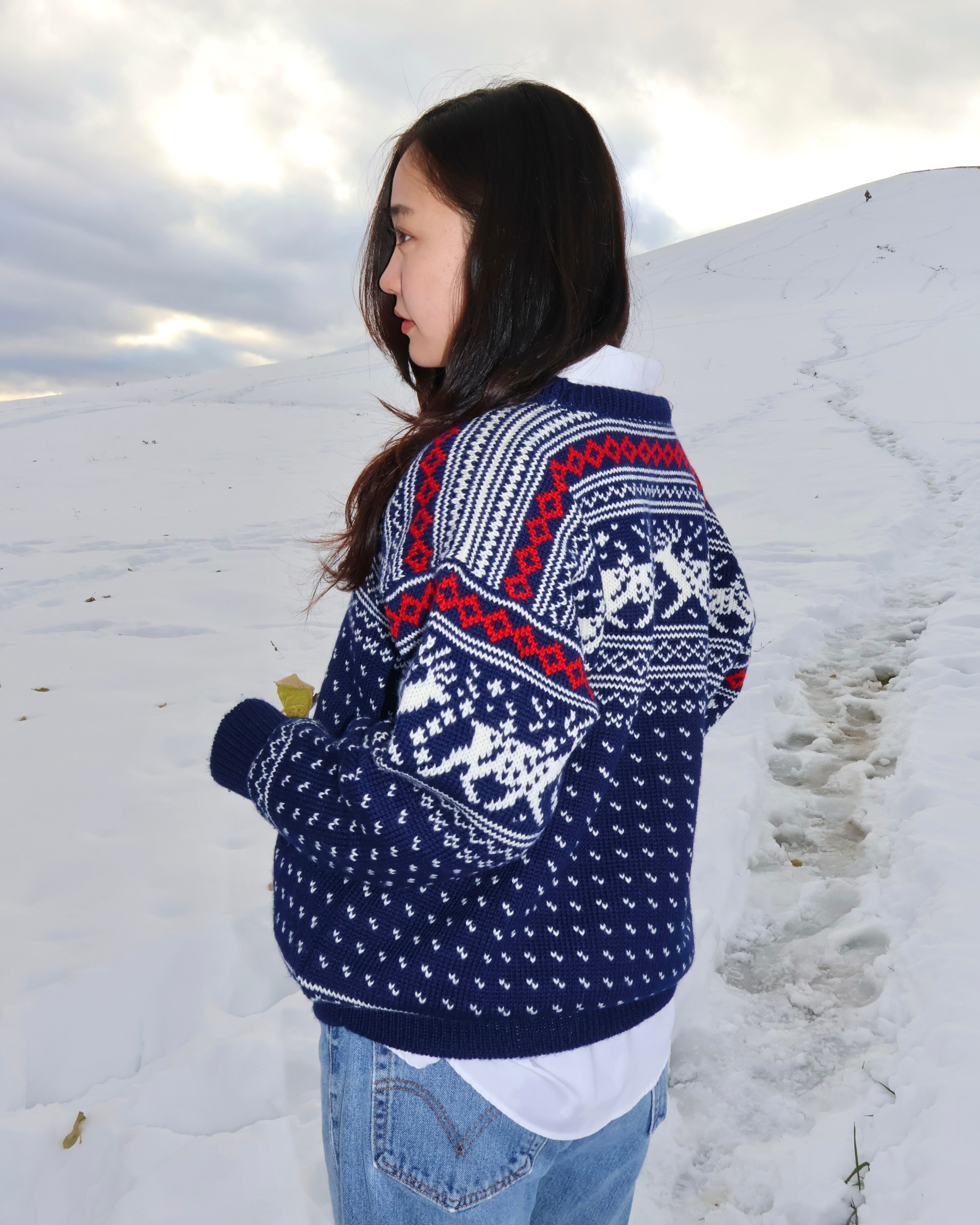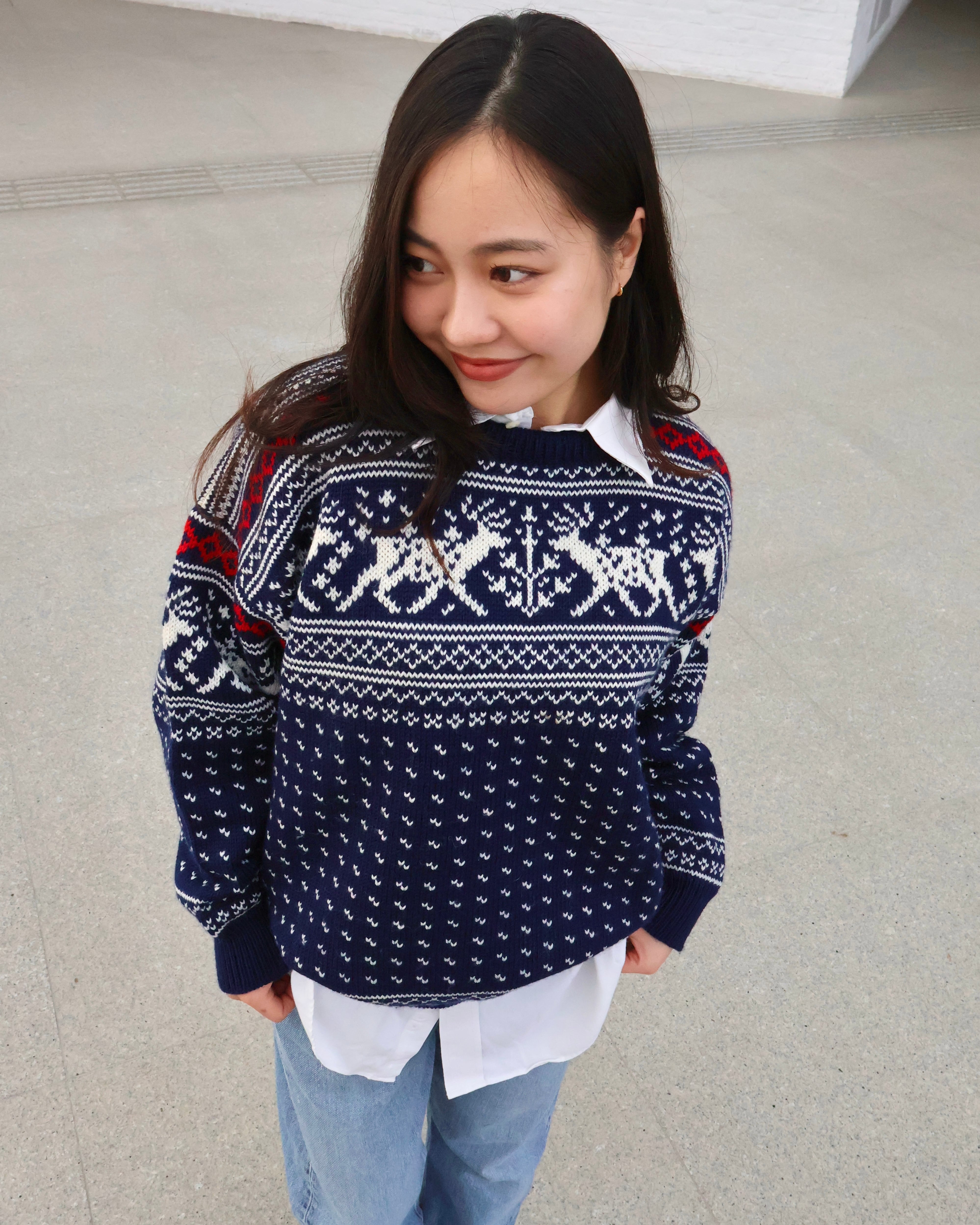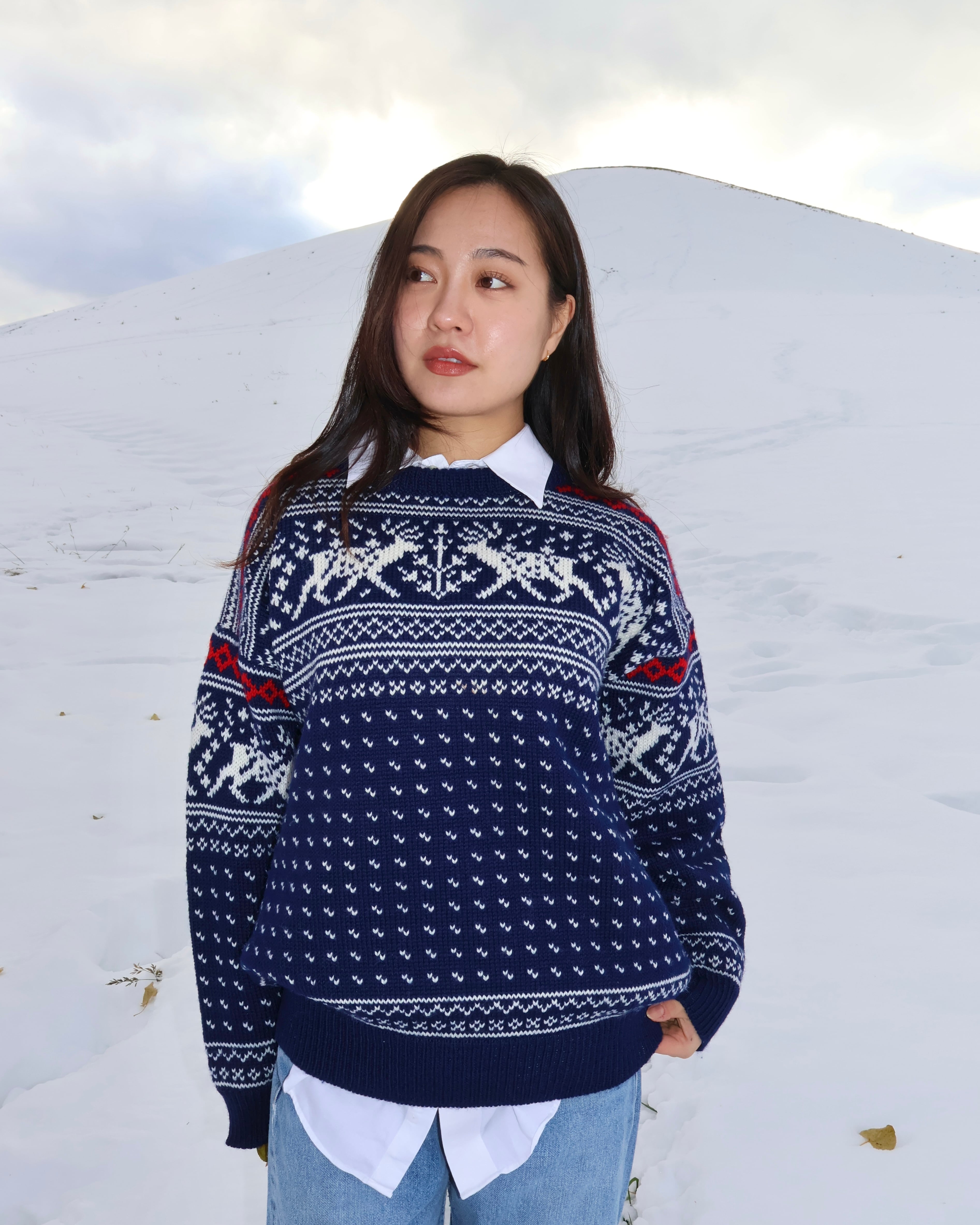 ネイビーで落ち着いた色味ながらも、トナカイ柄のデザインが施されており、着るだけで存在感を放ちます。